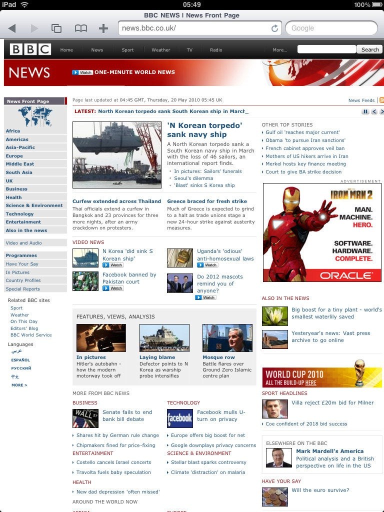 Liberated from the lack of pixels, Safari works that much better - just as well as a desktop browser, you could say. Indeed it's superior in some respects as touch simply feels more intuitive and faster than keyboard and mouse. The lack of Flash only proves annoying when embedded movies are completely absent from the page.