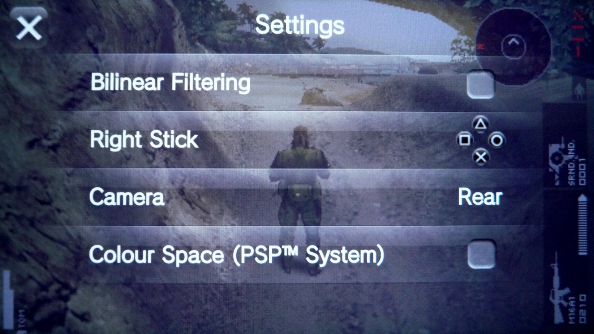 Emulation comes complete with options for full-screen filtering and a toggle for PSP colour space. These controls are accessed by holding a finger against the touch screen for a second, which also reveals mapping options for the right analogue stick and a switch for the camera. We put these to the test with Metal Gear Solid: Peace Walker to see if they actually made any kind of tangible difference to picture quality. Unfortunately no direct screenshots can be taken during PSP games (why?) so we have to resort to a little camera-work to show the differences.