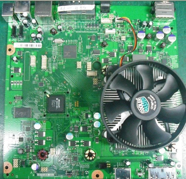 The location of the optical drive itself is a big improvement over the existing Xbox 360 design, which places the DVD-ROM directly above both CPU and GPU, further complicating the cooling of the hottest parts of the console. The cooling setup doesn't really tell us much. The Coolermaster fan would be way too large for a production console, plus you'll note that the fan itself is only secured in one place to the heatsink below.