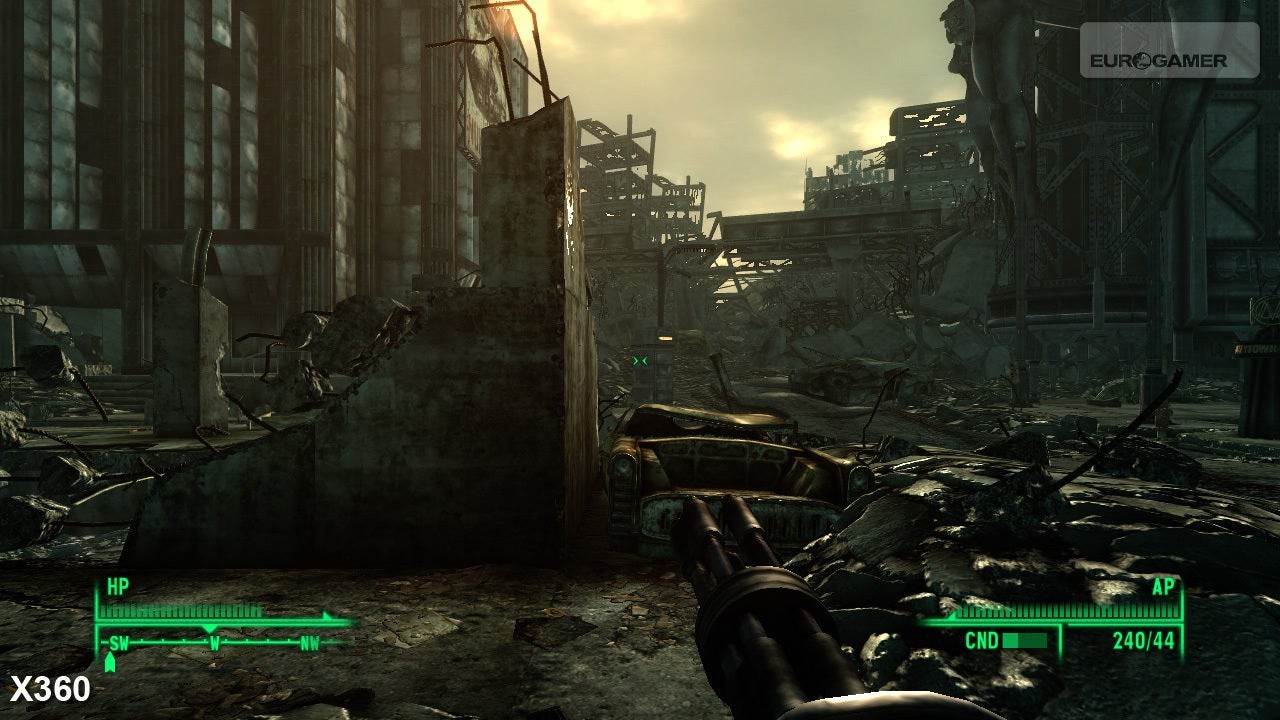 Fallout 3 on Xbox 360 and PlayStation 3, the action running at 25 per cent speed to retain image clarity. We also have a 360/PC face-off video and one for the equivalent PS3/PC comparison. Please ensure you have the 'High' quality setting selected.