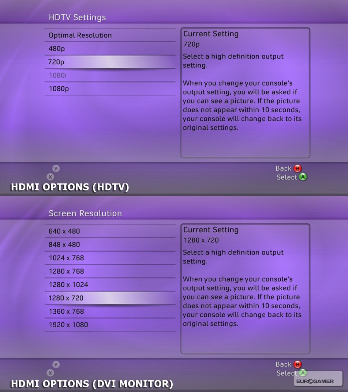But hook up a PC monitor using an HDMI-to-DVI cable and the console recognises that it's no longer in HDTV territory, and offers up its full range of VGA resolution options. This is a wonderfully insightful move by Microsoft - not only can you get the console to scale to the exact resolution of most displays, but it also means that even those cheapo Chinese GBP 100 LCD screens can be used as highly effective HD screens. So for those of us who play 360 in the study, bedroom or wherever, are well taken care of. Indeed, it's a shame that the same resolution options are not available when the Elite is connected to an HDTV. Very few displays actually run at native HD resolutions (1024x768 and 1366x768 being the norm) so it's impossible to get the Elite to scale to the exact resolution of the set.