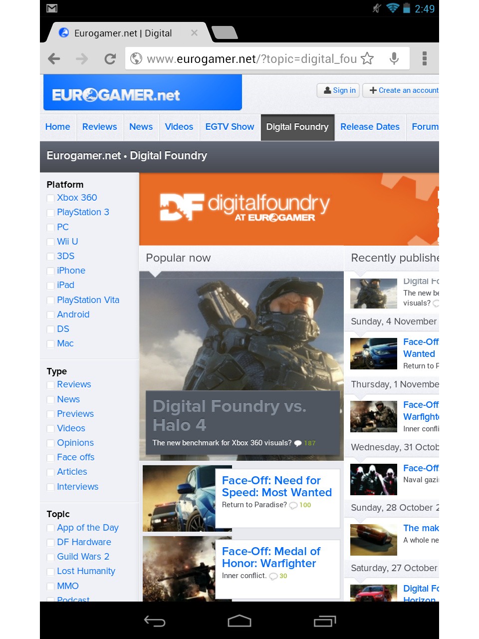 However, the capacitive IPS touchscreen display does have some drawbacks. While it's a solid performer for gaming and media playback, text rendering is a little off, a touch blurry - almost as if there's a small amount of upscaling going on (there isn't, but that's the impression). It's especially evident on small type, suggesting that lack of resolution may well be the issue. Additionally, while colour reproduction is generally good, the beautifully balanced hues of the Retina display aren't here - blacks generally impress but there's a definite yellow tinge to whites. The overall impression we get is of a screen that's a close match to the original iPad, shrunk down to the new 7.9-inch form factor, generally looking absolutely fine. However, the leap to the Retina display isn't just a matter of pixel count - vibrancy in the image takes a hit too.