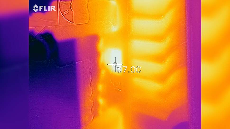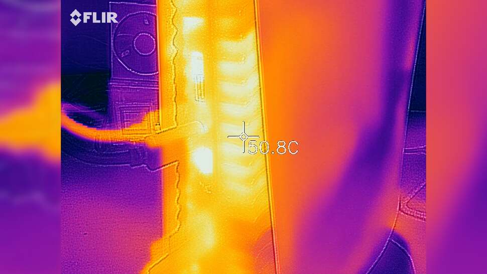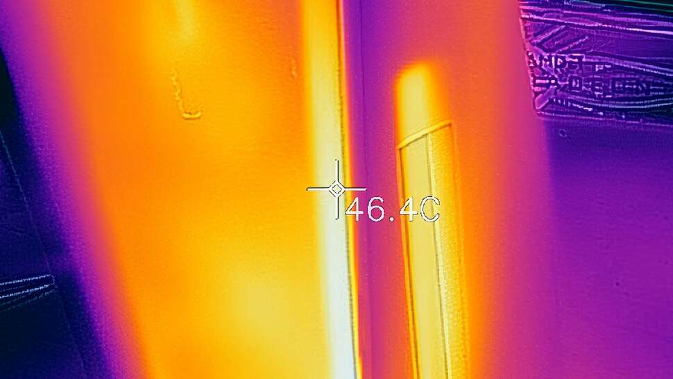 The top of the machine is essentially at room temperature, and even in the centre of the unit where the SoC lurks, the console's skin temperature is in the mid-30s Celsius. Some of the excess heat leaves the console via the vents in the centre, where temperatures rise to the mid 40s. However, the back of PlayStation 5 is the main escape route for heat - the whole rear of the unit is basically a big vent and temperatures hit around 50 Celsius max here, generally. The hottest point in the thermal photography comes in at 57 Celsius on the LAN port, but I think that's just the nature of metal conducting heat and not anything to worry about. All told then, job done: PlayStation 5 is larger than Xbox Series X, but it is also cooler. The key point is that the days of jet engine acoustics emanating from your Sony console are a thing of the past.
