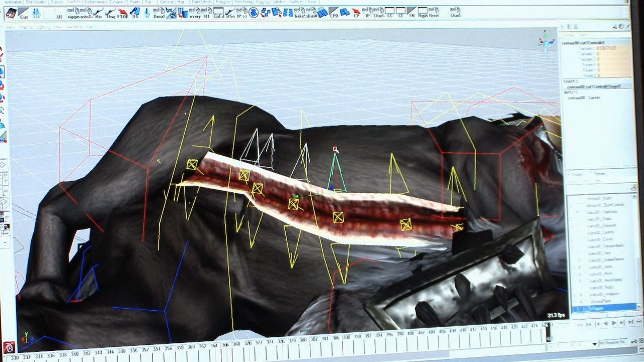 In terms of the character creations themselves, concept art and a low-poly mesh from Maya is handed off to the 3D modellers, who create the basic models using a sculpting tool known as Z-Brush. These models are then given detail - painted in via Photoshop - before being passed along the next stages in the art pipeline to the character riggers and animators.