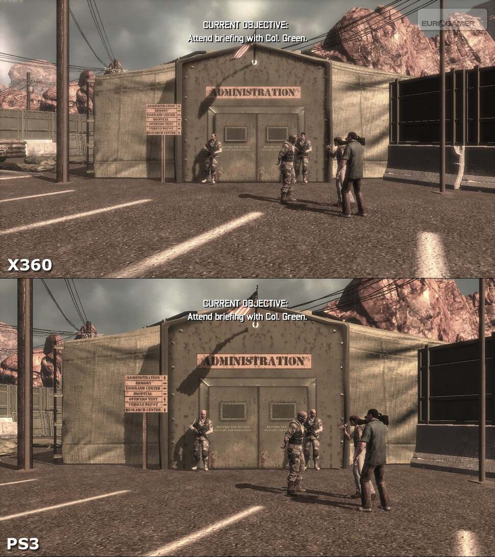 As you can see from the comparison shots, the PlayStation 3 game - in stills at least - retains much of the Xbox 360's look, with just the odd nip and tuck here and there, especially prevalent in the lighting. However, once you actually sit down and start playing, you're subjected to the most inconsistent frame-rate you've ever seen. Just moving forward at any given point is graphically inconsistent, with a refresh rate that arbitrarily drops for no apparent reason whatsoever. Once you're in the middle of a fire-fight, the frame-rate can plunge to single digits, and your mind needs to fill in the blanks to figure out what the hell is actually going on.