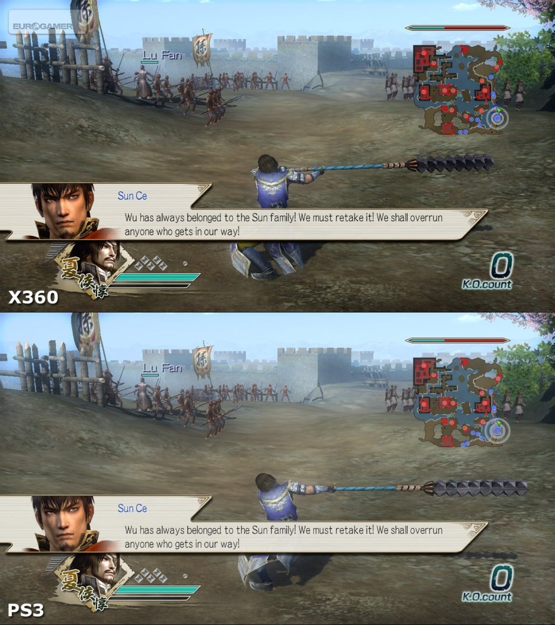 KOEI also deserves praise for the quality of its cross-platform development - indeed, it's pretty much the most consistent multiformat developer on the market today. We saw minor, barely perceptible, technical wins for both consoles with Dynasty Warriors Gundam (PS3) and Bladestorm (360) but the games were essentially identical in everything that actually mattered. With Dynasty Warriors 6, KOEI has upped its game still further, to the point where - during gameplay at least - the two versions are absolutely identical. Bearing in mind how little the Xbox 360 must contribute to KOEI's overall revenues, it's quite remarkable that the Microsoft box should get the obvious love and attention it does in the hands of these developers.
