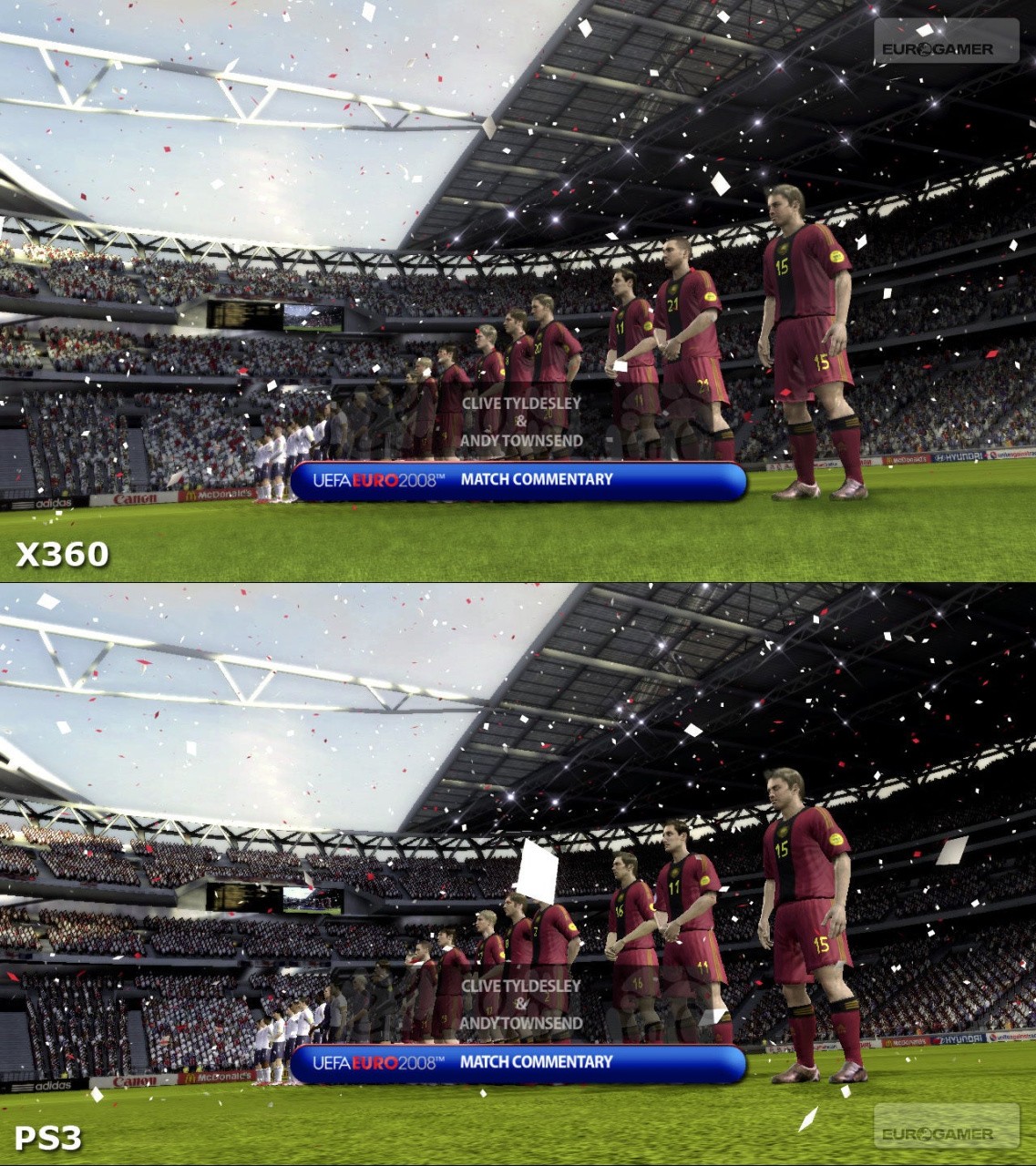 UEFA Euro 2008 is clearly based on the same engine, so once again PS3 owners can breathe easy. Sure, there's the odd difference here and there. The initial stadium cut-scenes (hardly super-smooth on 360) jerk pretty badly, grass textures aren't quite so detailed when viewed at close range and predictably, there's no anti-aliasing. However, all of this is barely noticeable in-game, only really becoming obvious if you're a heavy user of the replay modes and have astonishingly good eye-sight. In short then, a solid buy on either console - a game crammed with so many lovely elements that you can't help but imagine just how good FIFA 2009 is going to be.