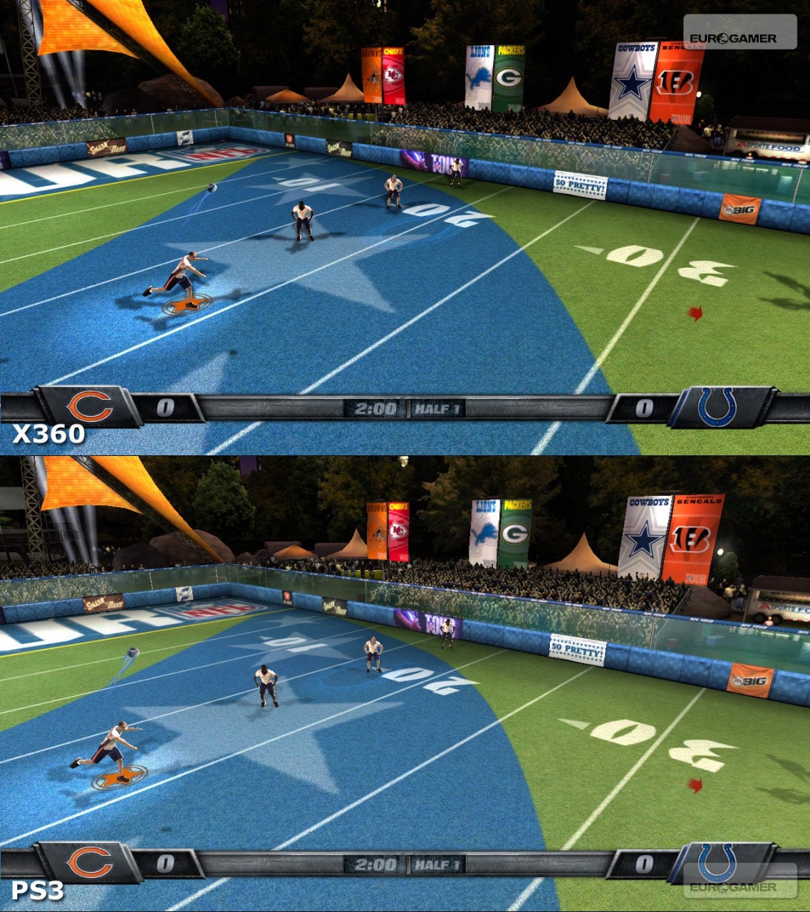 Similar to Madden NFL '08 (which I suspect has bequeathed a certain amount of its coding DNA to this project), the Xbox 360 version runs pretty solidly at 60 frames per second, while the PS3 version is closer to 30fps. That's if it reaches 30fps at all, with the pre-game fly-bys lurching and jerking horribly when compared to the super-smooth 360 release. While the drop in frame-rate didn't seem to have that much of an impact on the gameplay in Madden NFL 08, in a game that's supposedly based on a more arcade-style mode of action, the disparity between the two versions is more immediately apparent.