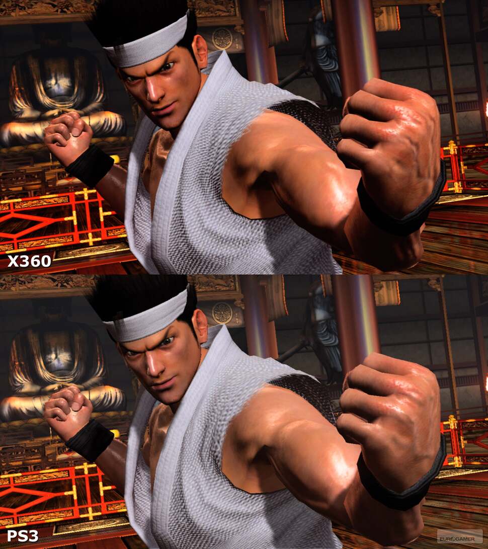 Of course, the headline enhancements are worthy of the lion's share of the comment. Yes, there is anti-aliasing on the visuals, but as you can see from the comparison shots, the difference is barely noticeable - even the 360 rendition has its share of 'jaggies' if you're anal enough to scrutinise the screens closely enough (that Shun shot for starters). And anti-aliasing isn't always a visual boon for me in many cases any way. For every smoothed-off edge the 360 version has, the PS3 game has a certain smidgen of additional clarity to the point where neither version really looks any better than the other. Also, the 360 game's pre-fight posing sequences are occasionally prone to the tiniest v-lock screen tear (always at the bottom tenth of screen if you're crazy enough to want to look for it) which is not present in the PS3 version.