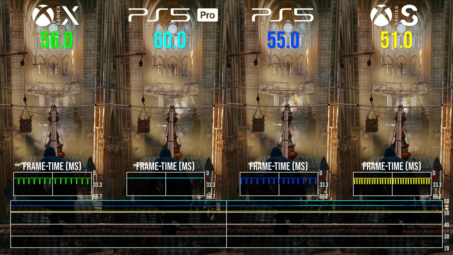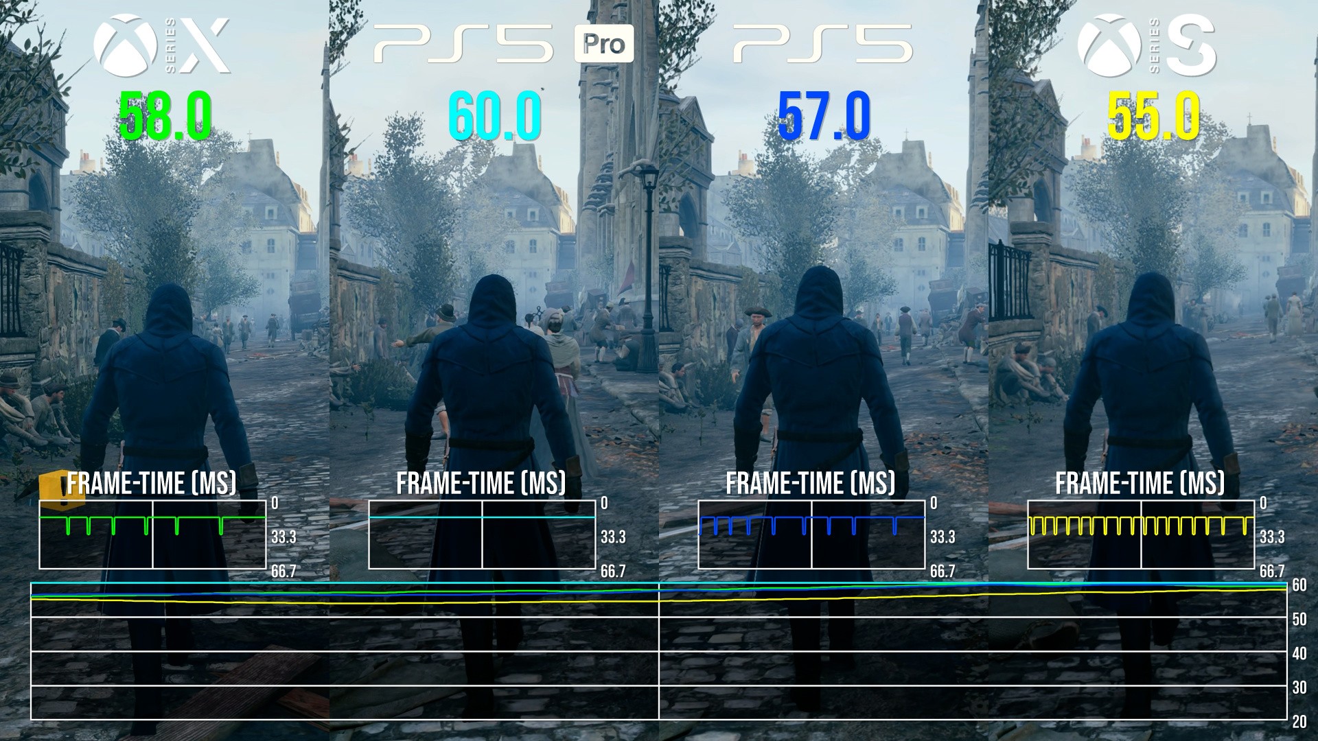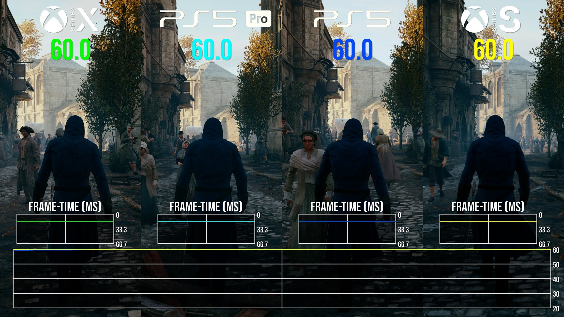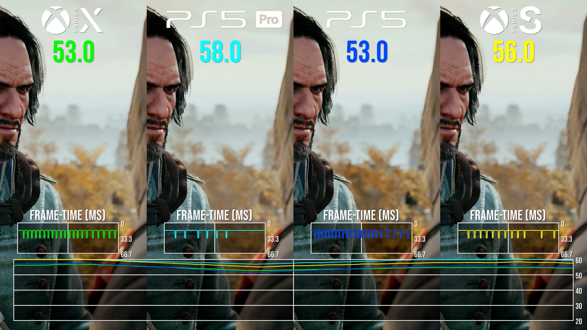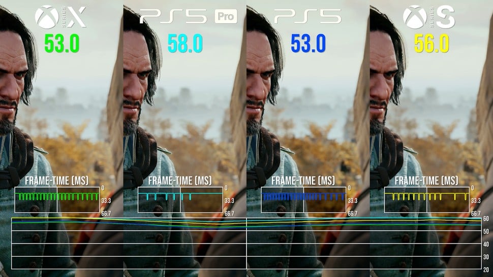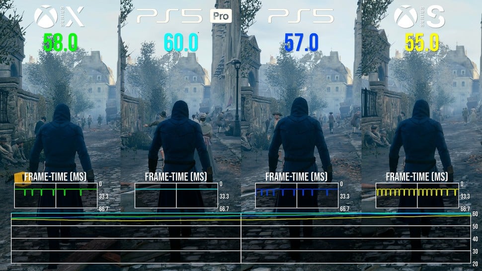 So what about the 60fps? Well, it's true to say that swathes of gameplay will run at 60 frames per second, but it's very much context dependent. It's fairer to say that the majority of the game runs in a 50-60fps window, with some dips into the 40s in very heavy scenes - and during many cutscenes, where Ubisoft uses an extremely heavy depth of field effect that cuts hard into your frame-rate. The highest overall frame-rate is delivered by PlayStation 5 Pro, but to be honest, I'd still prefer Series X: Xbox's system-level VRR works on back-compat games where PS5 does not. So, the vast resolution increase and VRR support means that the game looks best on Series X and runs in a consistently smooth manner.
