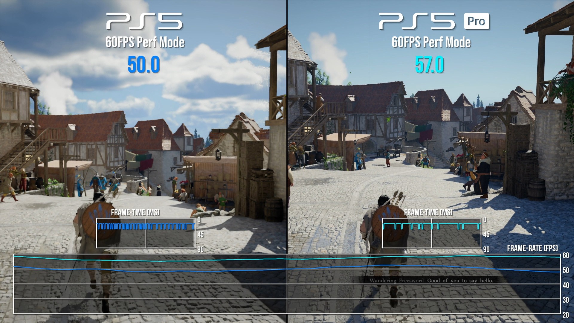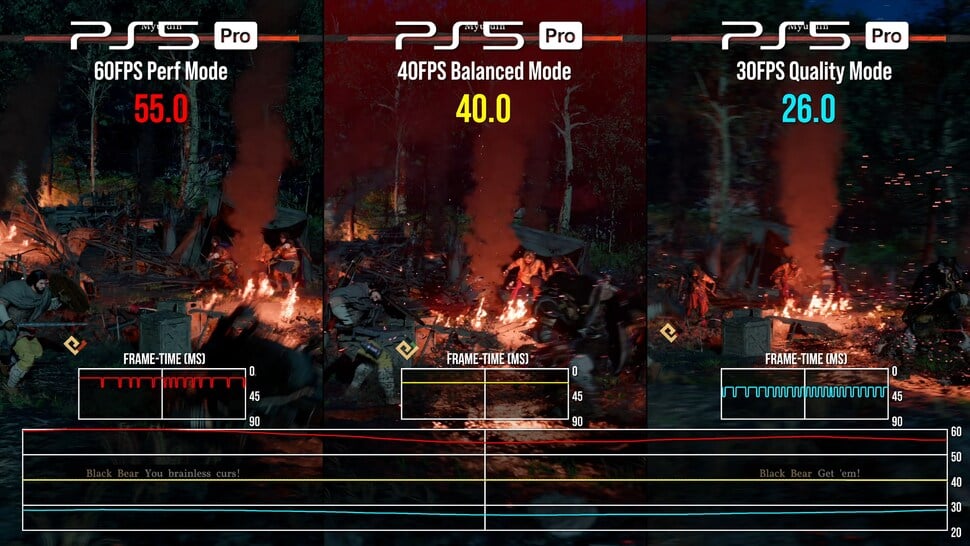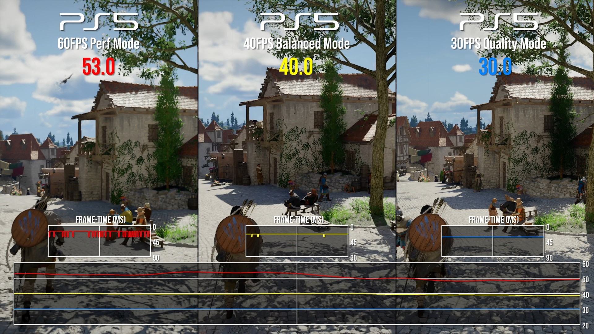 The performance mode frame-rates we've discussed so far account for GPU-limited situations but be prepared for CPU limitations as well. We've already talked about "Bug Hill", an area near Demeniss, that puts you in the middle of a massive battle with ludicrous enemy counts. This is where hopes of a locked 60fps go to die: all three base PS5 modes push identical sub-30fps numbers at the nadir.