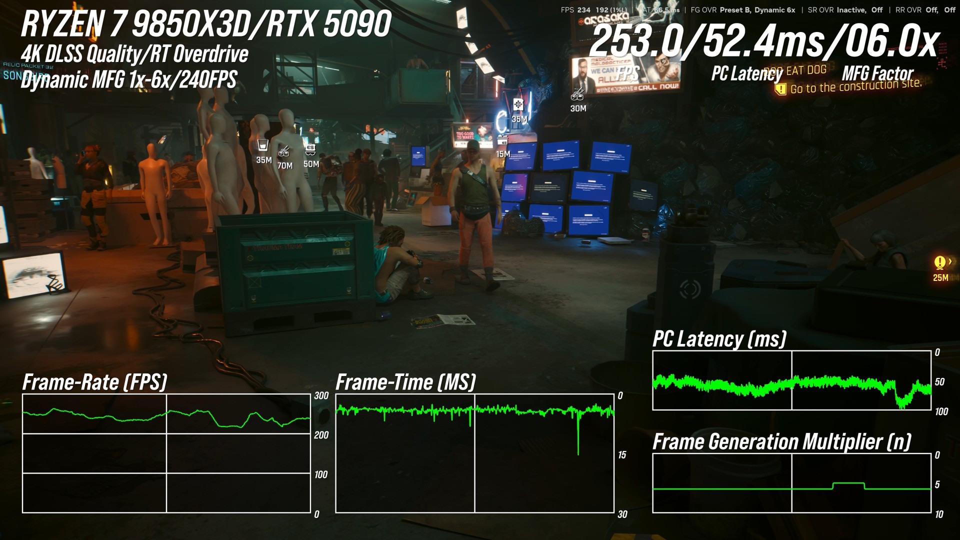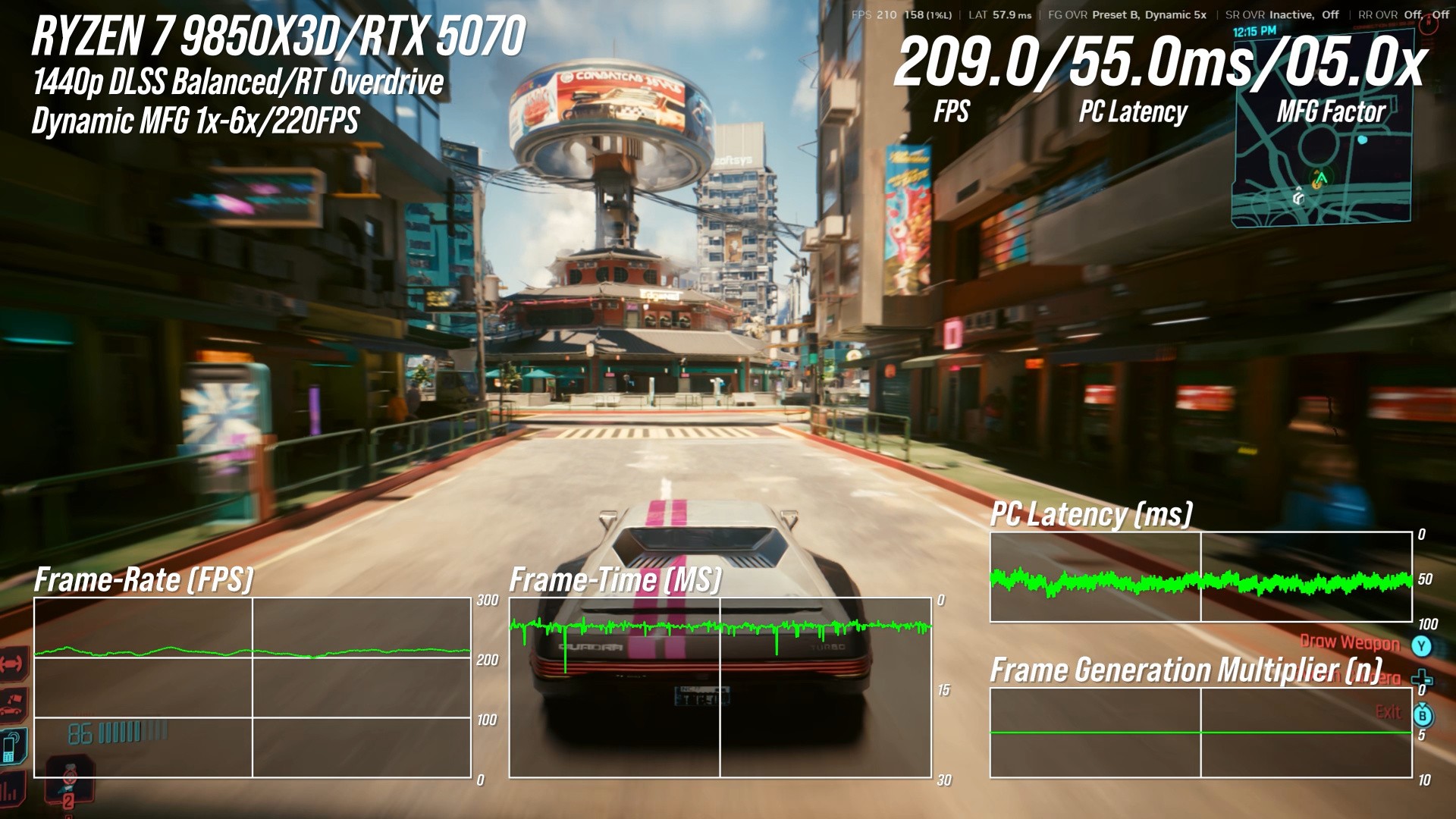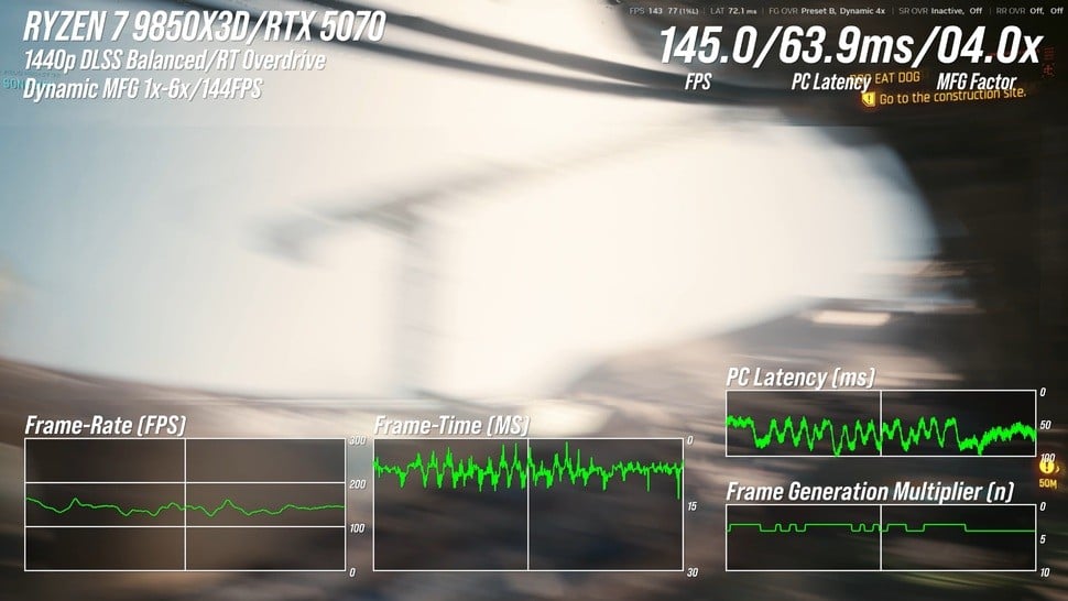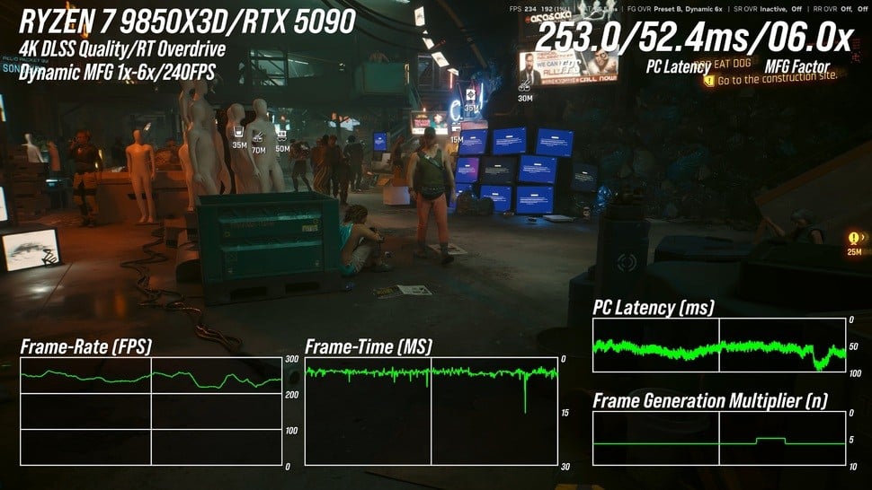 My RTX 5070 testing also included attempts to ascertain how fine-grain the change in multi-frame generation factor is. By waggling the mouse between the view of the sky and then towards the dense market in Cyberpunk 2077, we should be putting the algorithm fully through its paces. There, we found some issues. Frame-times and latency went haywire, which isn't ideal, but we did find that the minimum time taken to change multi-frame gen factor - around 150ms, but that is at the 144Hz limit. It may well be more responsive across higher refresh rates.