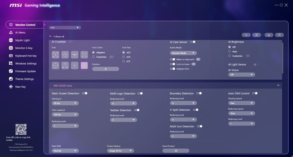 It makes perfect sense too, given the 'always-on' mentality while using a PC, Mac or Linux. So, if you're wary of the health of your OLED panel, you'll know that feeling of constantly feeling the need to switch the screen on and off. MSI's AI sensor effectively takes on that job on your behalf. As an added bonus here, while the screen is on, a new multi-icon detection option is added to MSI Care 3.0. It's a variation on the other modes, this time isolating the windows screen's program icons and dimming them where needed. And again, all of these features allow MSI to extend the 'panel protect' to a more generous, less intrusive, 24 hours, up from the 16 hours of the last model.
