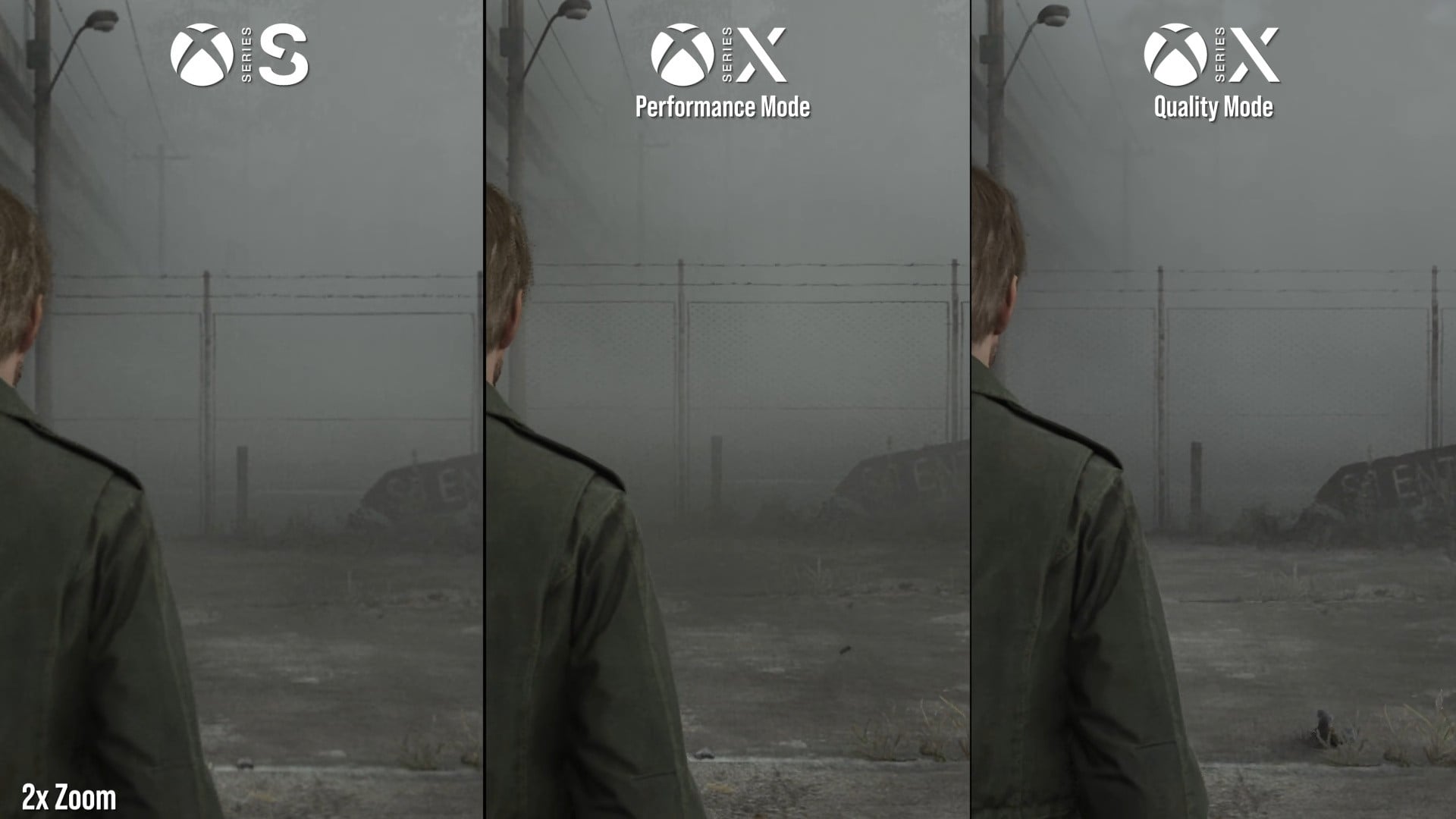 When lined side-by-side, Series S's base resolution sometimes proves too low for TSR to amply resolve, and Silent Hill 2's visual characteristics suffer as a result. Lead character James' head sways noticeably while walking, and TSR here struggles to resolve the disocclusion artefacts of his head moving back and forth, even more so than other consoles. Plus, distant details like power lines and fence meshes either poorly resolve or don't materalise compared to Series X's 60fps performance mode.