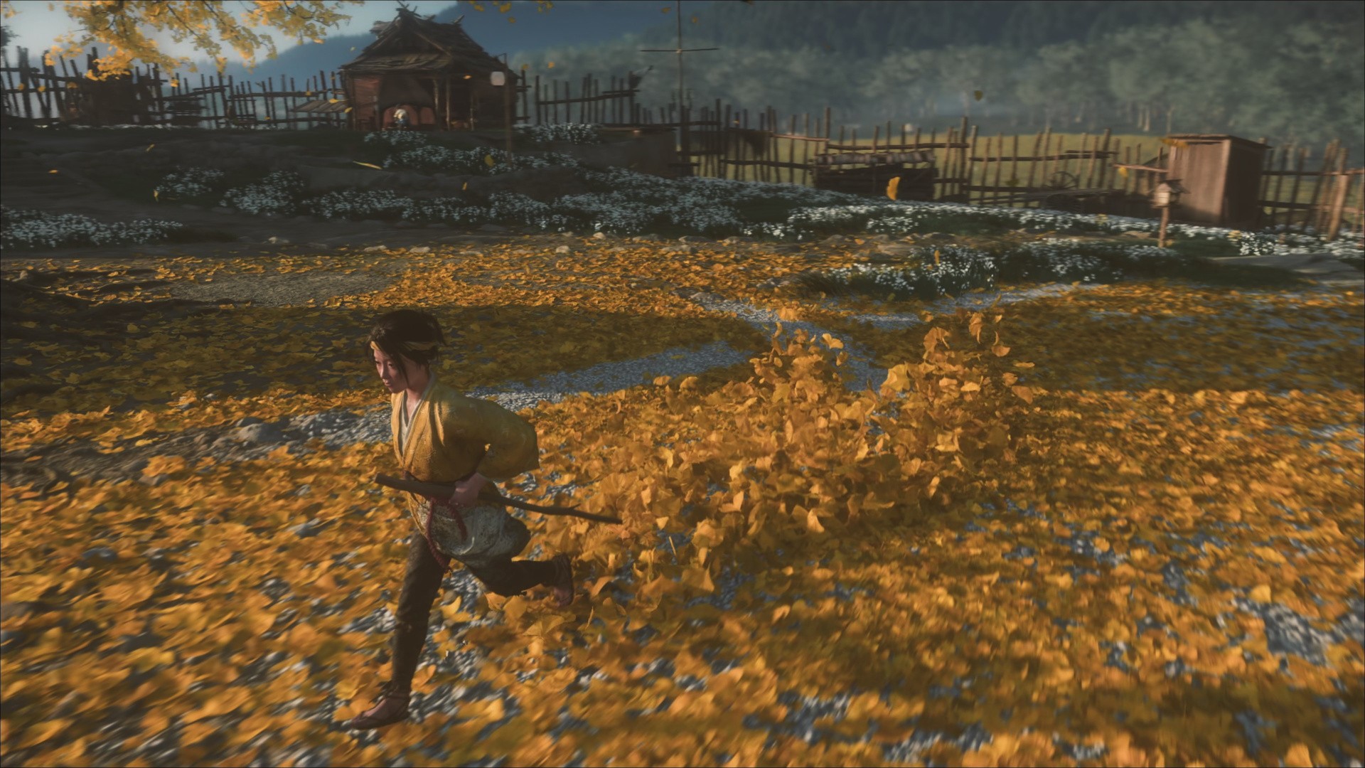 Adrian: That stuff is somewhat similar. In Ghost of Tsushima, we had a mix of particles and also textures that represented a sparser version of leaves. But in this one, they just turned the particles to 11, and they used that as the only way to represent leaves on the ground. and so you can knock them all around. It's not in all situations, but in your homestead area, that's one of the areas where you can you can see it a lot.