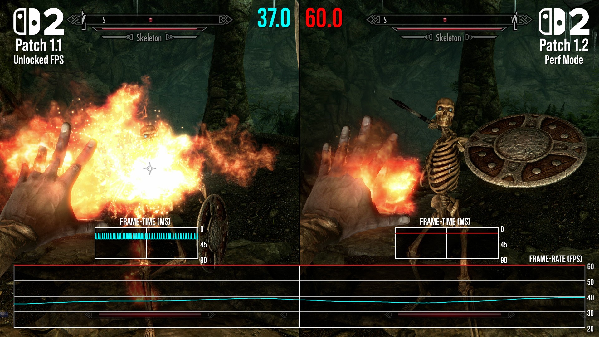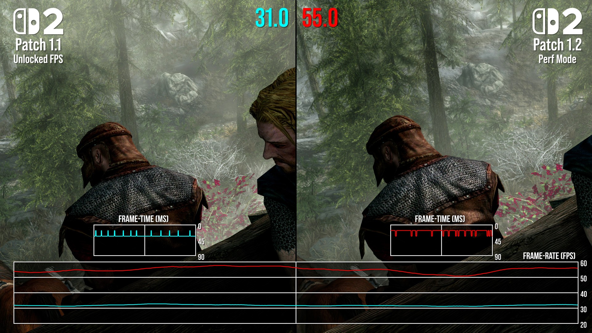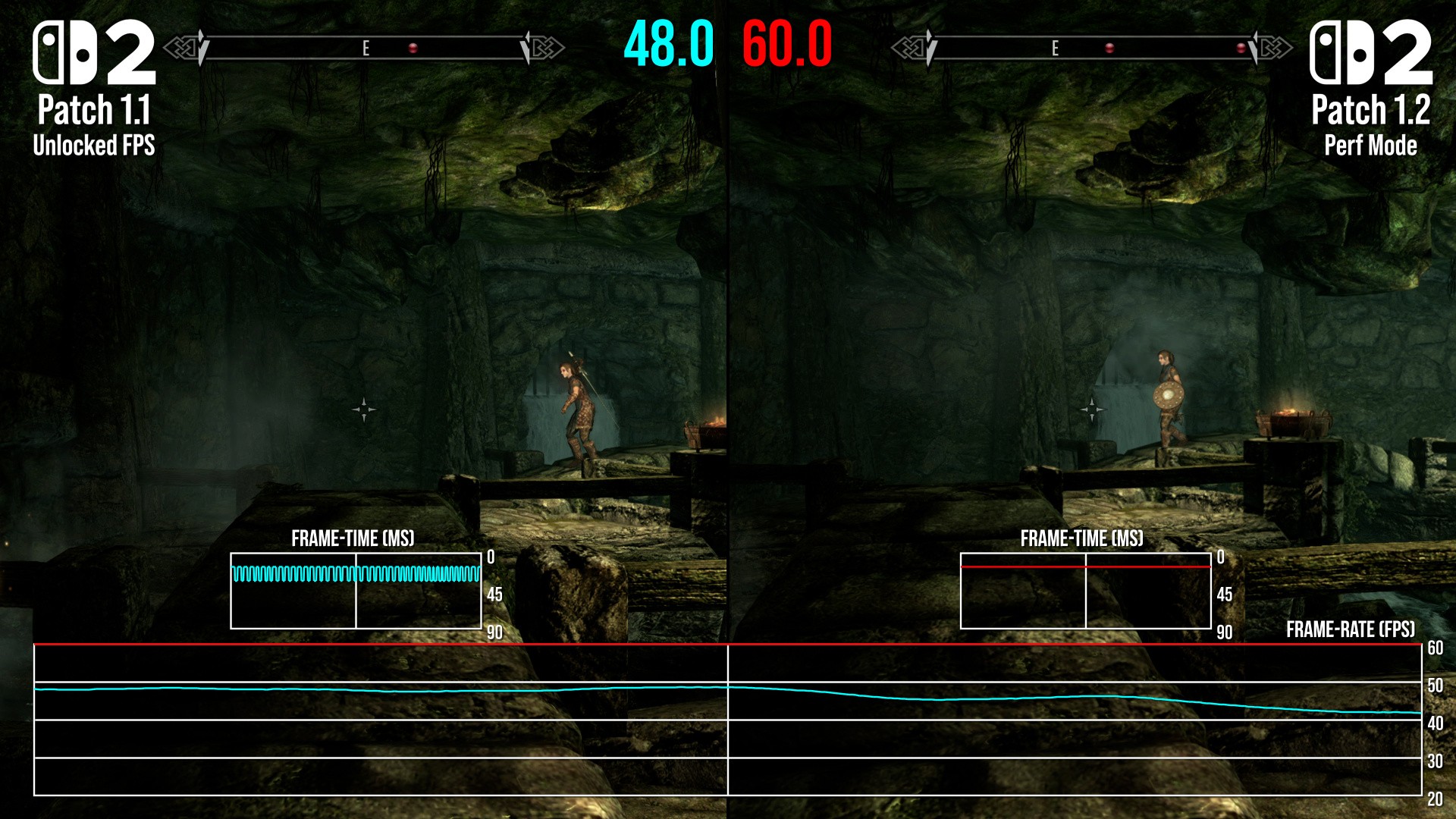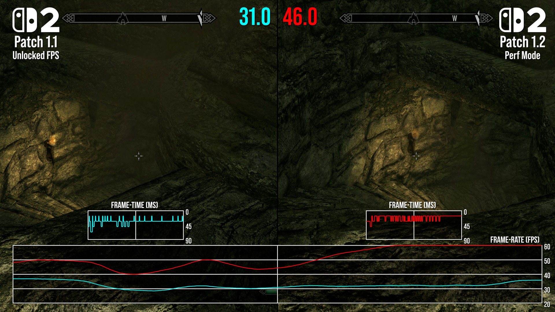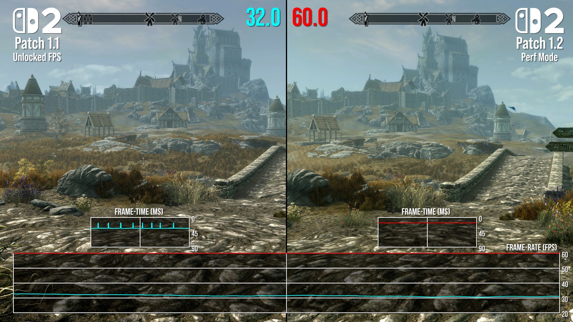 The performance mode is generally a success. In docked play, the game now consistently hits 60fps in most dungeons and open-world gaming. For instance, the entire route from Helgen Keep down to Whiterun City runs at a near-faultless 60fps, a massive jump from the 30-35fps range of Patch 1.1, effectively doubling the frame-rate in these areas. However, the 60fps mode is not without its flaws, primarily related to traversal and busy scenes. The game is still prone to occasional lurches and hitches, which are likely tied to world asset streaming on the Creation Engine, causing drops to nearly 30fps with sizeable frame-time spikes.