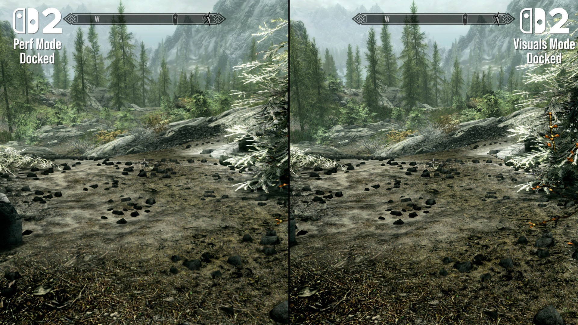 Achieving a more consistent 60fps required the developers to implement visual cutbacks. The 30fps visuals mode maintains a native 1440p resolution - upscaled via DLSS - while docked, which is identical to the launch settings. In contrast, the new 60fps performance mode uses a lower, dynamic resolution ranging from 576p to 1080p, also DLSS upscaled. The lowest 576p is seen under heavy GPU stress, while 1080p is rare. This necessary reduction in rendered pixels results in a softer image and more visible artifacting, shimmer, and flicker, especially across the horizon in the visually dense world of Skyrim.