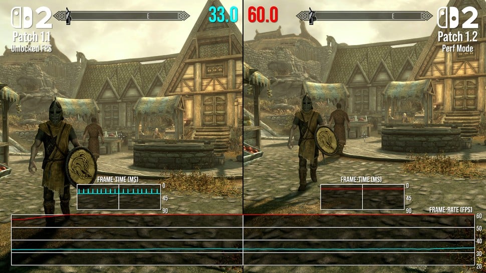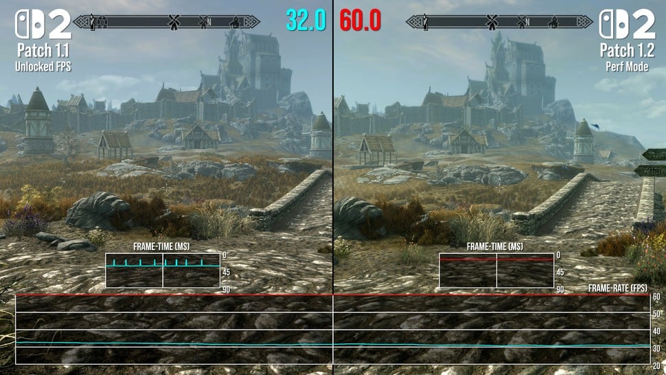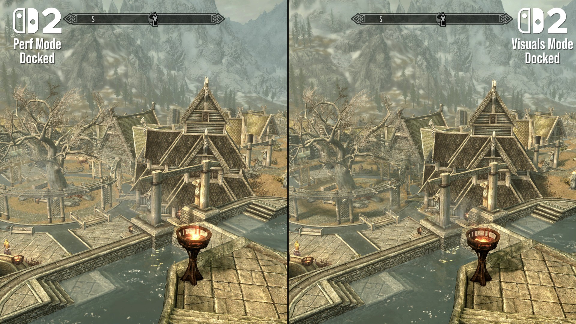 These hitches are more exposed at 60fps than they were at a capped 30fps. Busy towns and open world battles also push the limit of the Switch 2: the opening sequence, with multiple on-screen NPCs and volumetric fog, constantly wavers from 50-60fps. Later dragon attacks can be erratic, hitting 40-60fps, while dense towns like Riften see the frame-rate tumble into the 50s. Despite these outliers, the mode is a significant improvement but not on par with performance modes seen on other current-gen consoles.