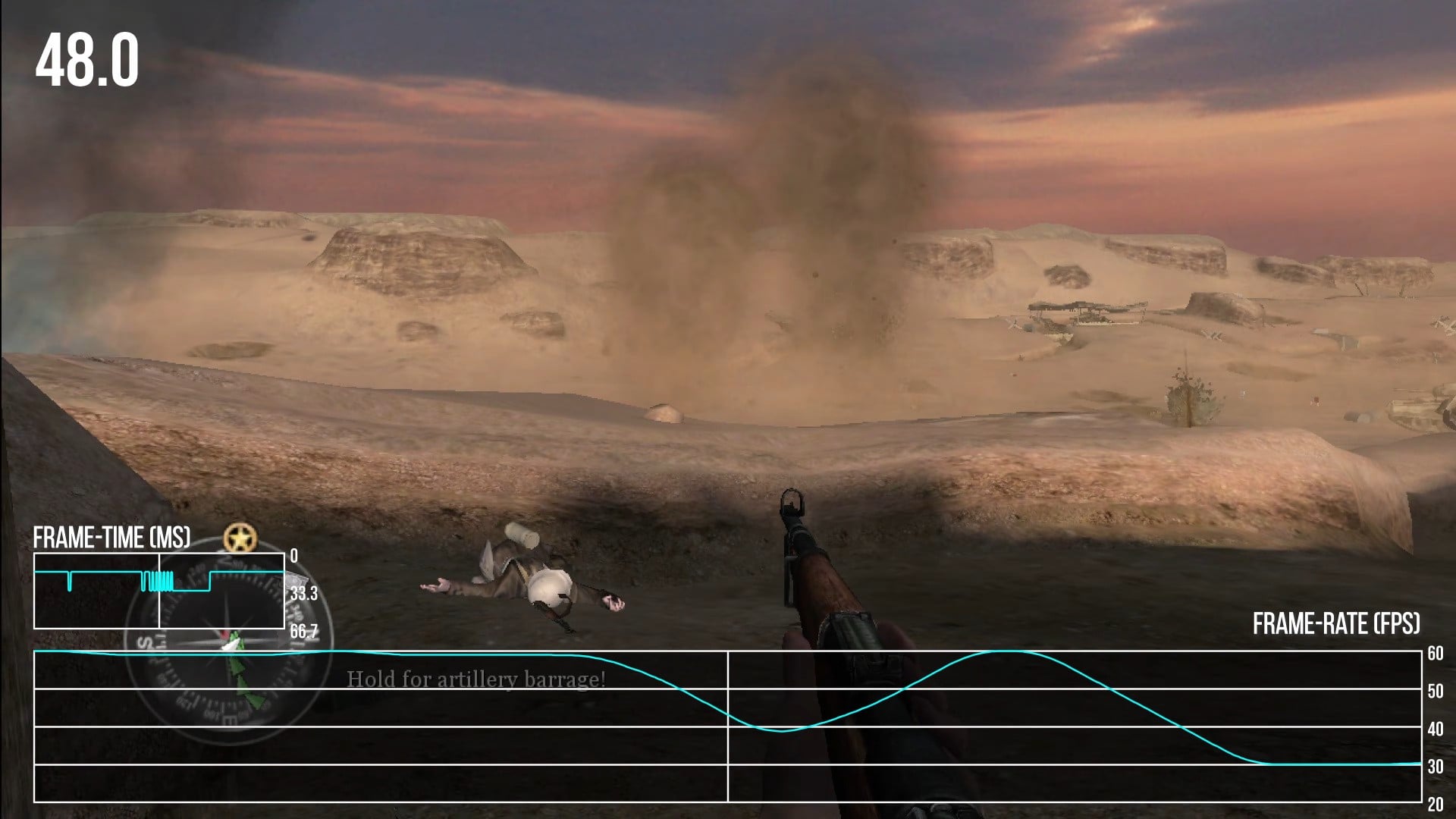 But its visual demands proved too much for Xbox 360, and thanks to its use of double-buffered v-sync, CoD2's frame-rate frequently dipped from a 60fps maximum to only 30fps. PC players admittedly had their own tough time reaching 60fps on even high-end systems of the time. Developer Infinity Ward famously solved for 60fps gameplay in future, mega-popular sequels on Xbox 360.
