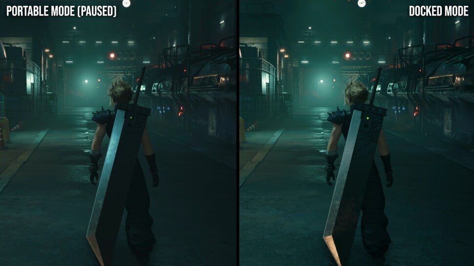 Portable mode appears to target a 30fps frame-rate, but we perceive dips beneath that 30fps line almost immediately as the camera sweeps from the distance towards Cloud and his allies in the opening train sequence - and those dips are not present in docked mode. Without the ability to directly capture and measure frame-time cadence, we so far would say portable mode performance is thus far comparable far to a PS4. That's pretty solid for the visual makeup on display, even though we wonder how well the game can maintain that close-to-30fps level as the adventure moves into more demanding and open regions beyond this demo's scope.