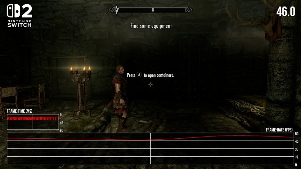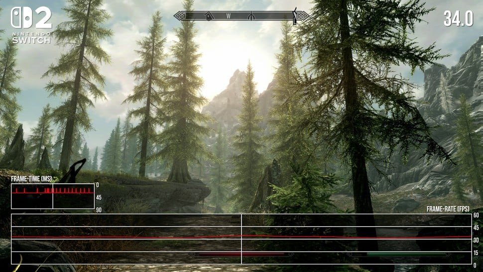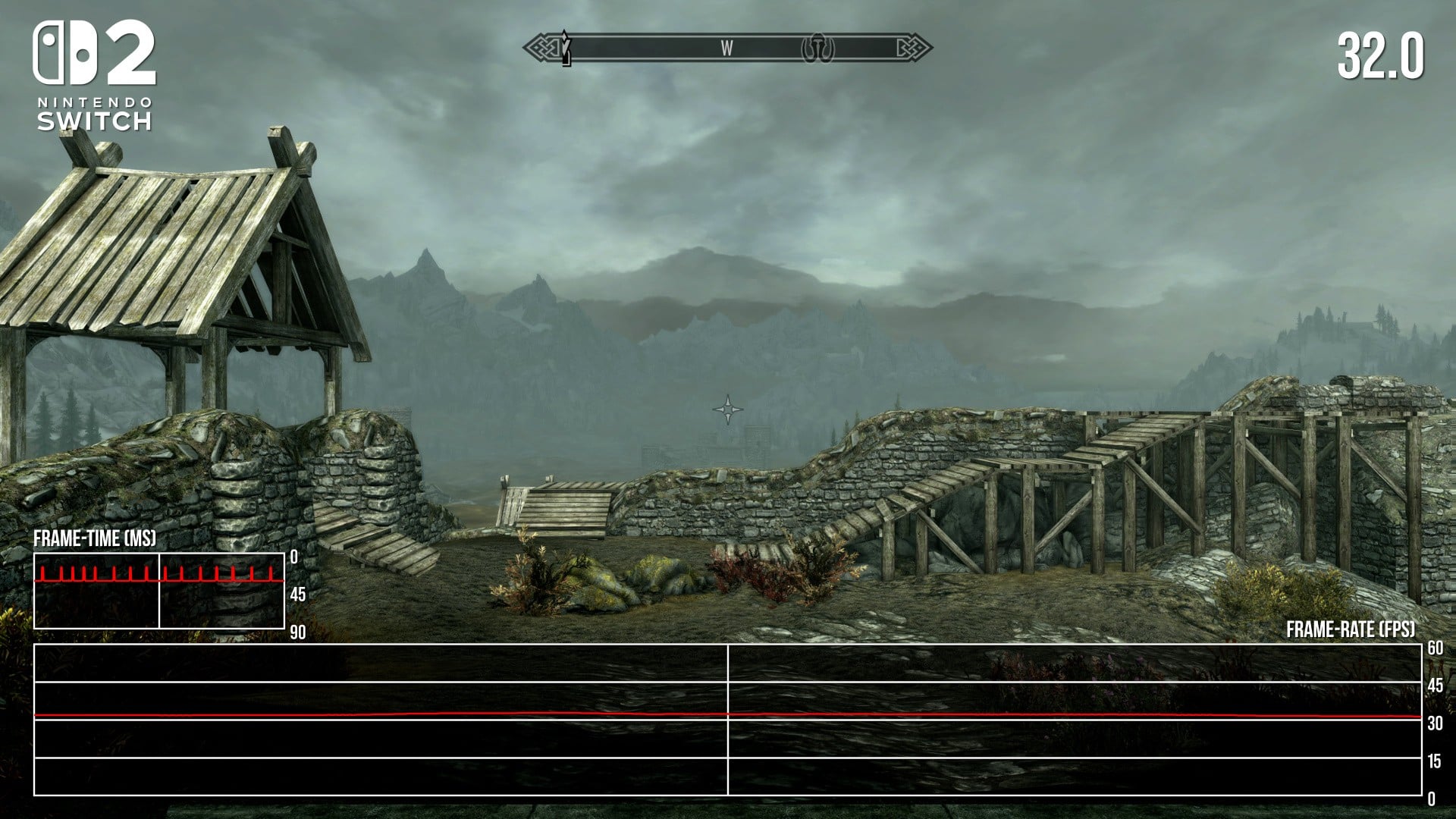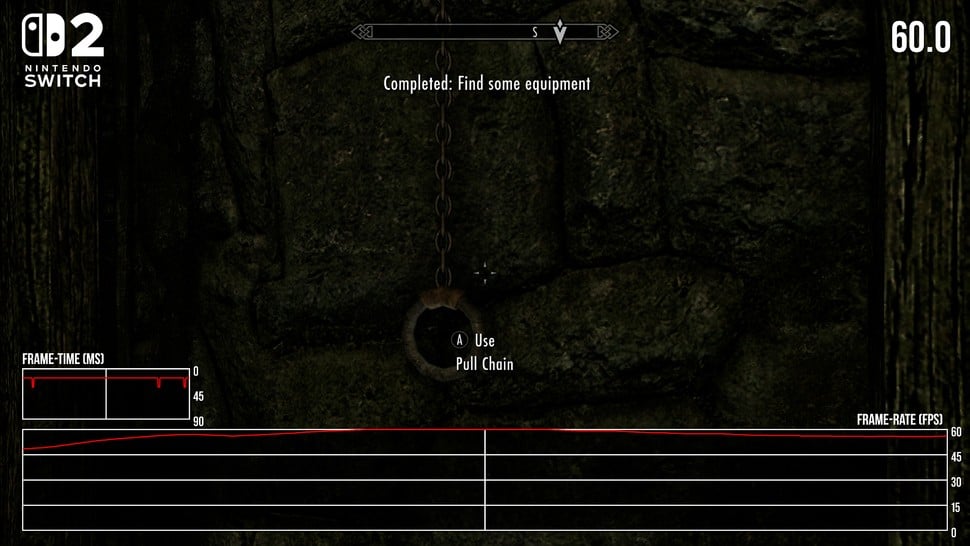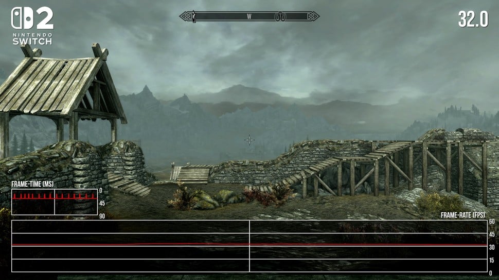 Thanks to this unlocked frame-rate, we can also now measure a maximum 60fps frame-rate for the Switch 2 port, which we can reach by aiming our viewpoint toward the ceiling of a dungeon like Helgen Keep with no other geometric detail on-screen. This is a rarity in our current testing thus far, with most normal gameplay reaching nowhere near the game's v-synced 60fps refresh rate. We've yet to measure noticeable frame-rate dips beneath 30fps, and direct glances at complex scenery measure very close to 30fps - albeit with jumpy frame-time spikes.