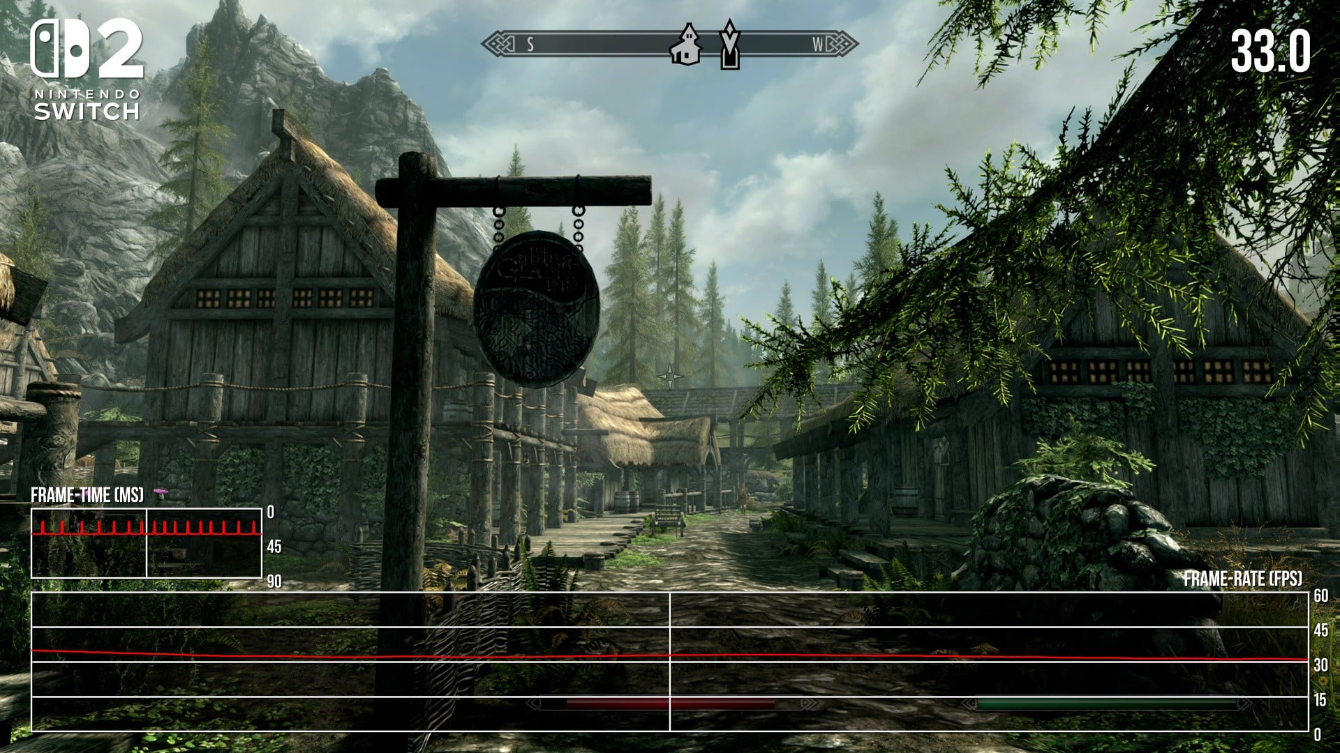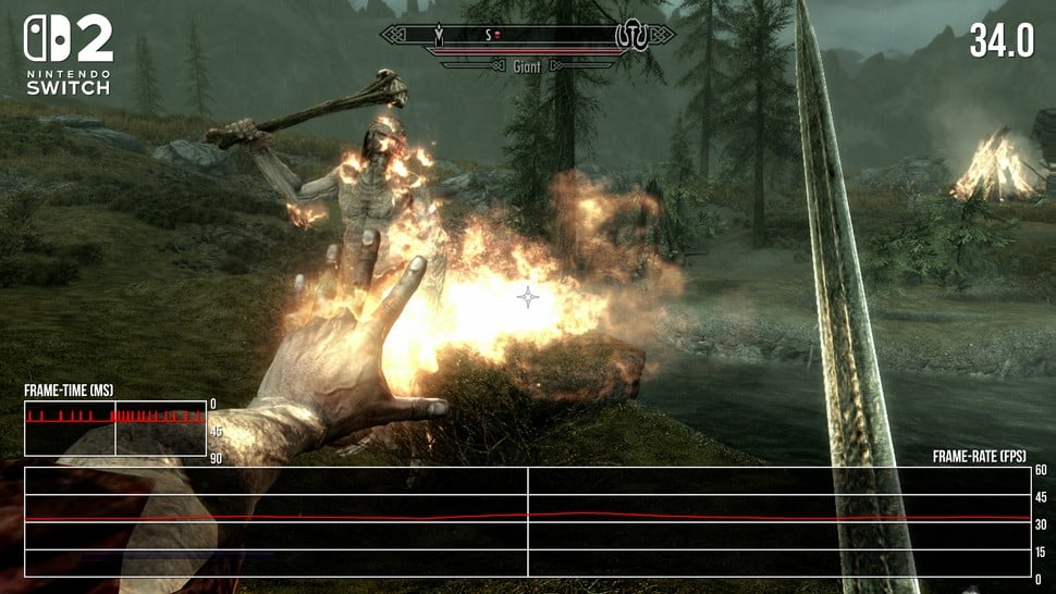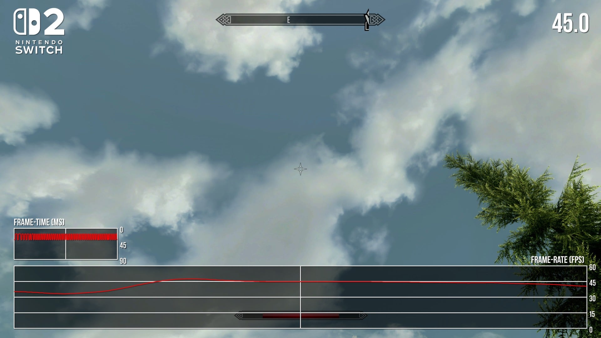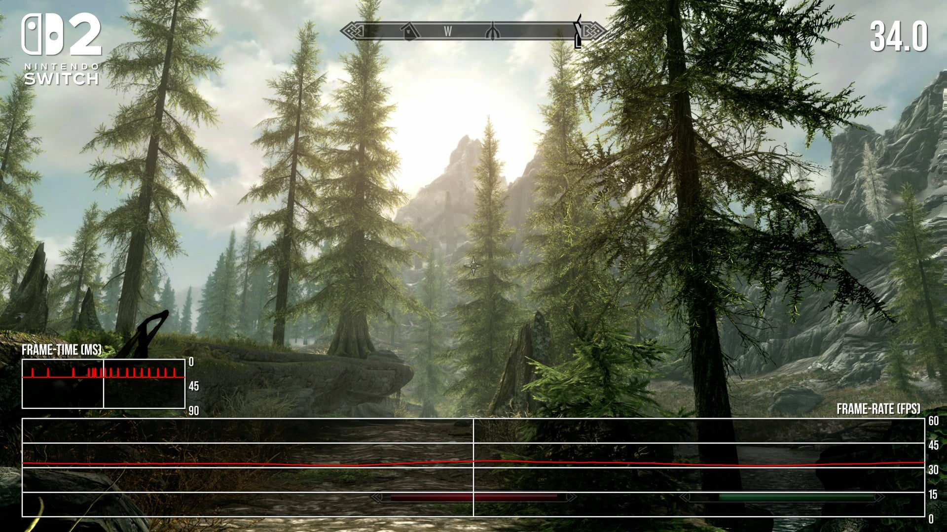 Thanks to this unlocked frame-rate, we can also now measure a maximum 60fps frame-rate for the Switch 2 port, which we can reach by aiming our viewpoint toward the ceiling of a dungeon like Helgen Keep with no other geometric detail on-screen. This is a rarity in our current testing thus far, with most normal gameplay reaching nowhere near the game's v-synced 60fps refresh rate. We've yet to measure noticeable frame-rate dips beneath 30fps, and direct glances at complex scenery measure very close to 30fps - albeit with jumpy frame-time spikes.