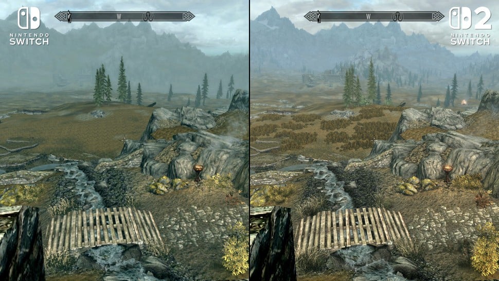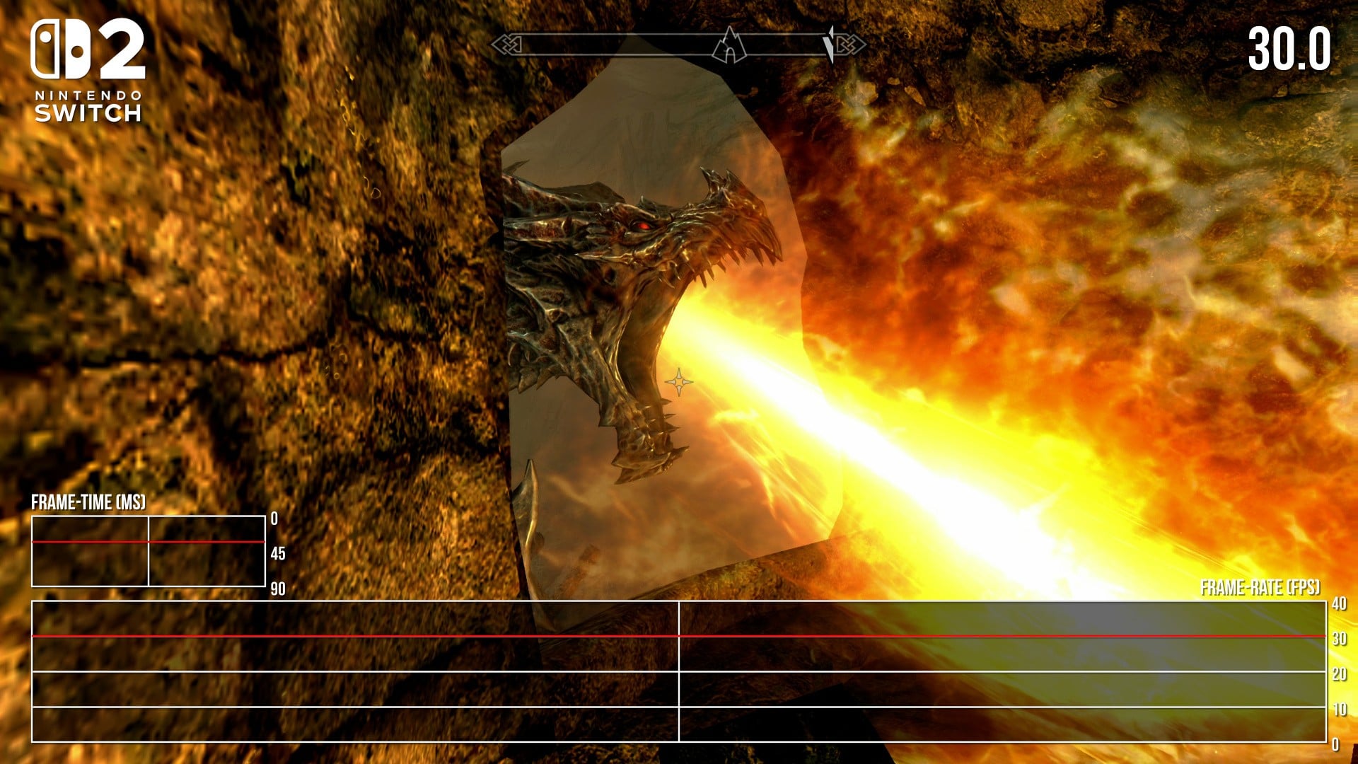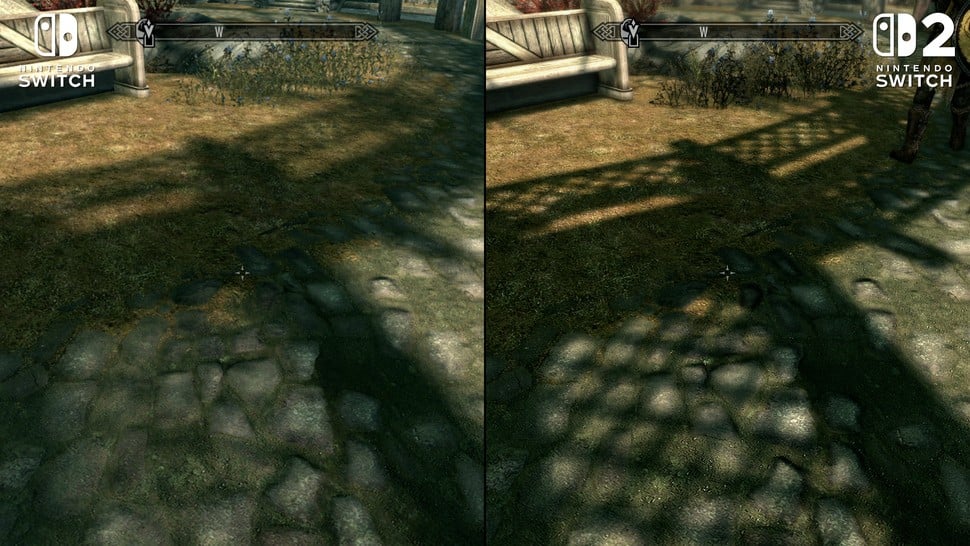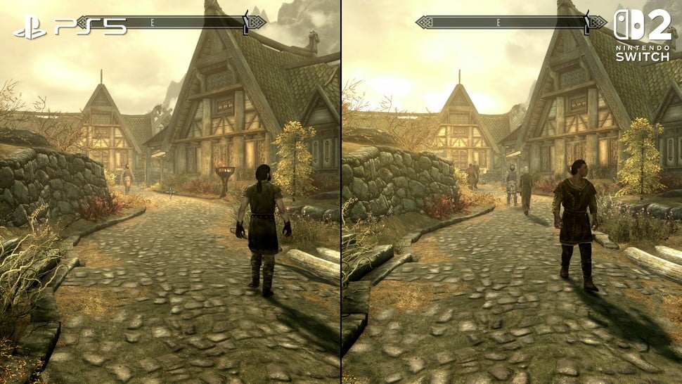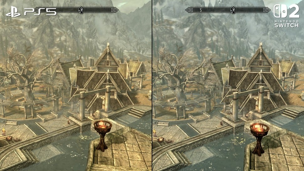 As a reminder, Skyrim on PS5 may run at a higher maximum frame-rate, but its performance dips into the 50s during intensive effects-filled moments like bursts of dragon fire or plumes of waterfall droplets. Switch 2's 30fps frame-rate does not buckle in like-for-like tests. And loading times on Switch 2 aren't too much worse than on PS5 - 4.9 seconds to load into the game's first open-world entrance on PS5 compared to 8.6 seconds on Switch 2. That's much less than the 28.7 seconds for the same content to load on Switch 1.