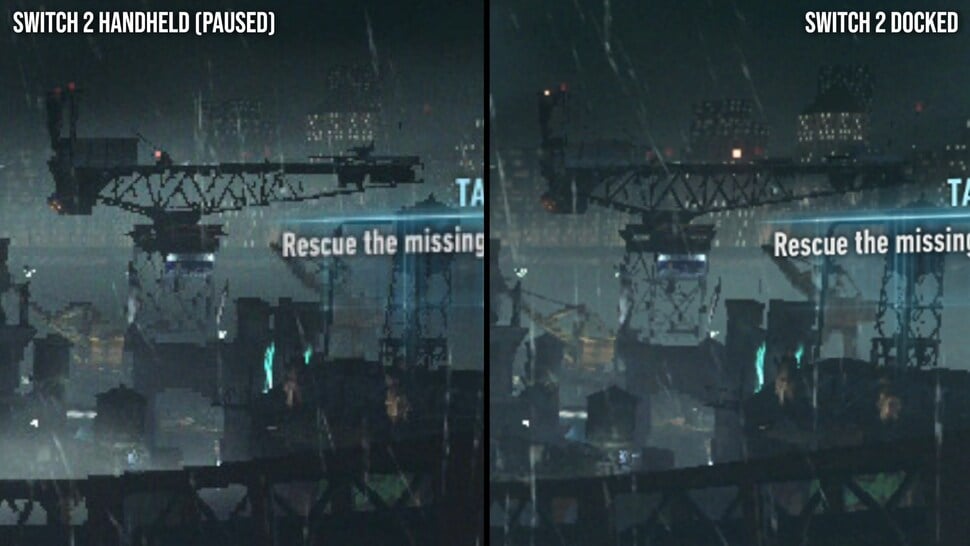 Our pixel-counting process has confirmed that the game's portable mode resolution is now upgraded from its Switch 1 540p count to 720p on Switch 2 while otherwise not updating its anti-aliasing methodology or any other visual settings. In docked mode, Arkham Knight still runs at 810p, and when we put Switch 2's portable and docked modes side-by-side, we can only faintly detect a difference, owing to how close those resolution counts now are - especially since 720p on a smaller screen can look convincing enough in motion.
