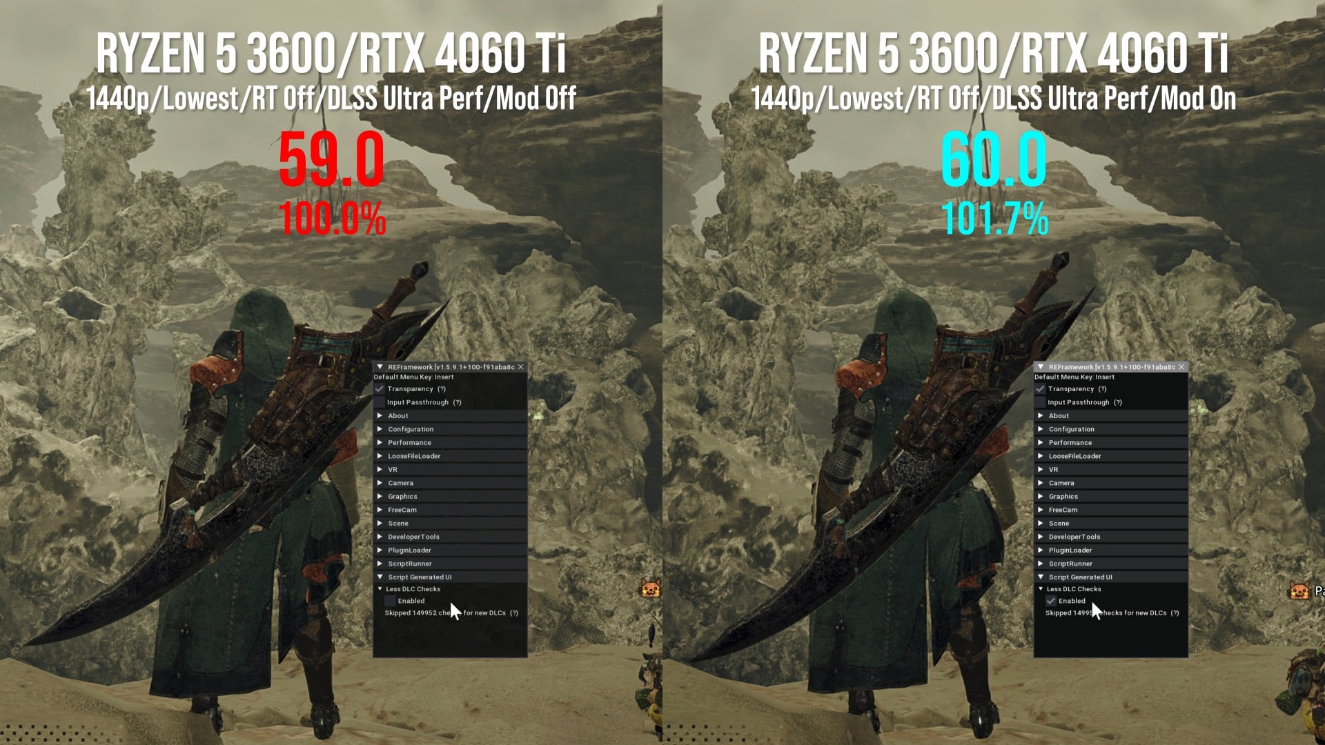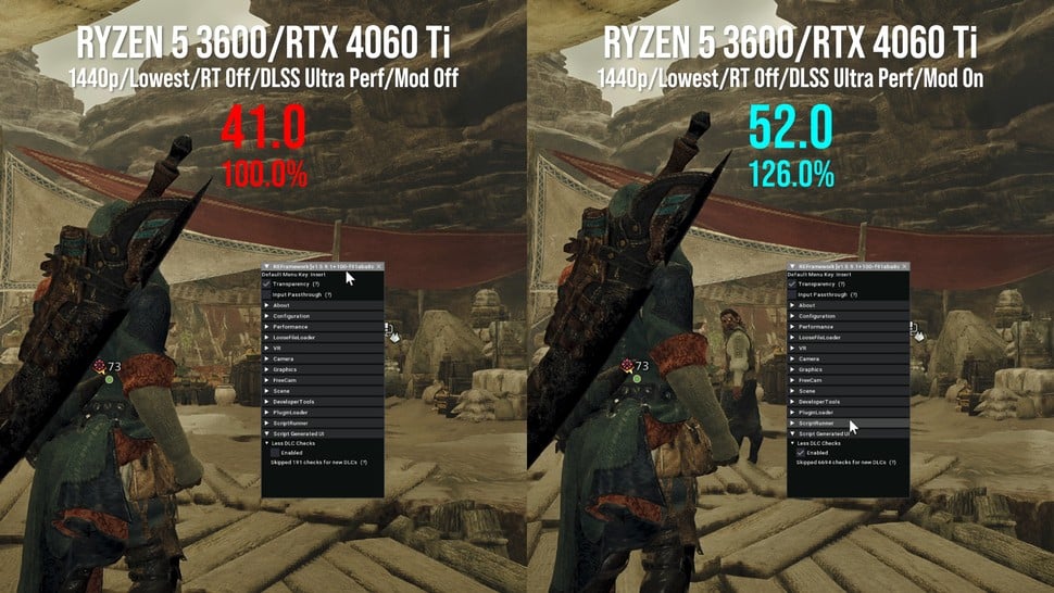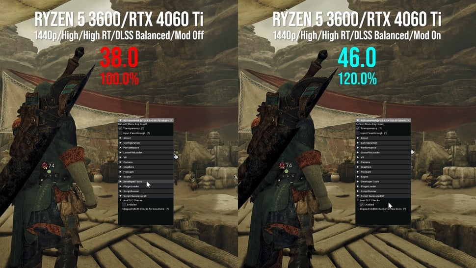Since this appeared to be a CPU issue, I used a Ryzen 5 3600-based system to verify the report, paired with an Nvidia RTX 4060 Ti. Then I downloaded the "Less DLC Checks" mod, which turned out to be invaluable. The mod plugs into the RE Framework modding tool and when active, it indicates when the game code is checking for the presence of downloadable content. You see, it turns out that it's not the lack of DLC that is causing the performance problems, it's the game checking to see if you have it or not. In hub areas in certain conditions, Monster Hunter Wilds can flood the CPU with DLC checks and the upshot is that it does impact performance if you don't have DLC installed.