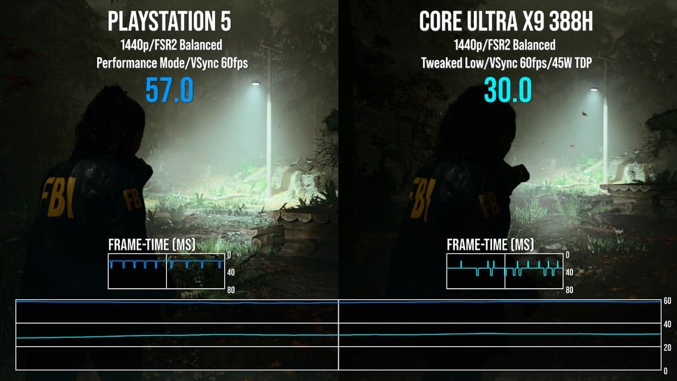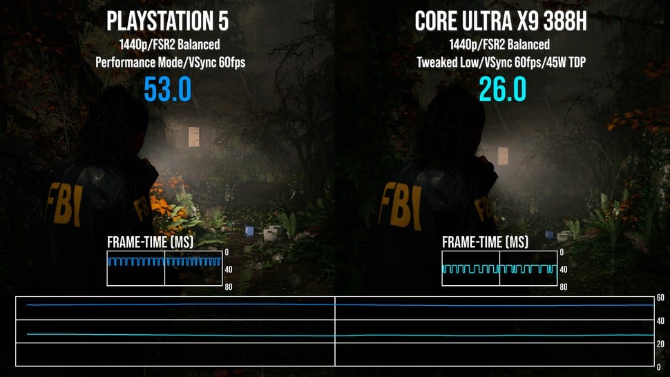 Next up, I went back to the standard PS5-equivalent settings: what I had already, but running FSR2 balanced mode instead of performance mode. Here, we're reminded quite rudely that Panther Lake has its limits, with the console offering a 92 percent performance lead - 55.25fps vs 28.91fps (the console's result hampered just a touch by the fact it can hit its 60fps v-sync cap.)