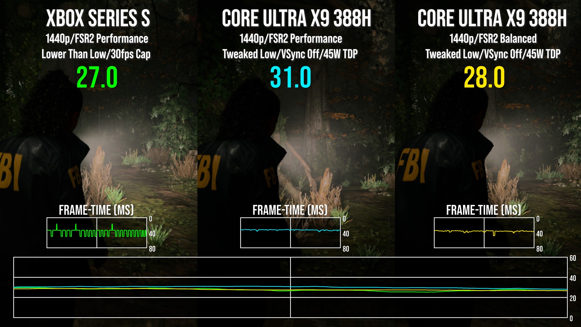 The result from Panther Lake was impressive, especially bearing in mind that 1440p output resolution isn't typically associated with any PC SoC barring Strix Halo. I couldn't quite achieve a locked 30fps, but I did get quite close: a 29.54fps average - seven percent higher than Series S with its more compromised feature set. The improvement might not sound tremendous, but it's actually the difference between a reasonably steady 30fps with mostly even frame-pacing and a far less stable, more jerky experience on the junior Xbox.