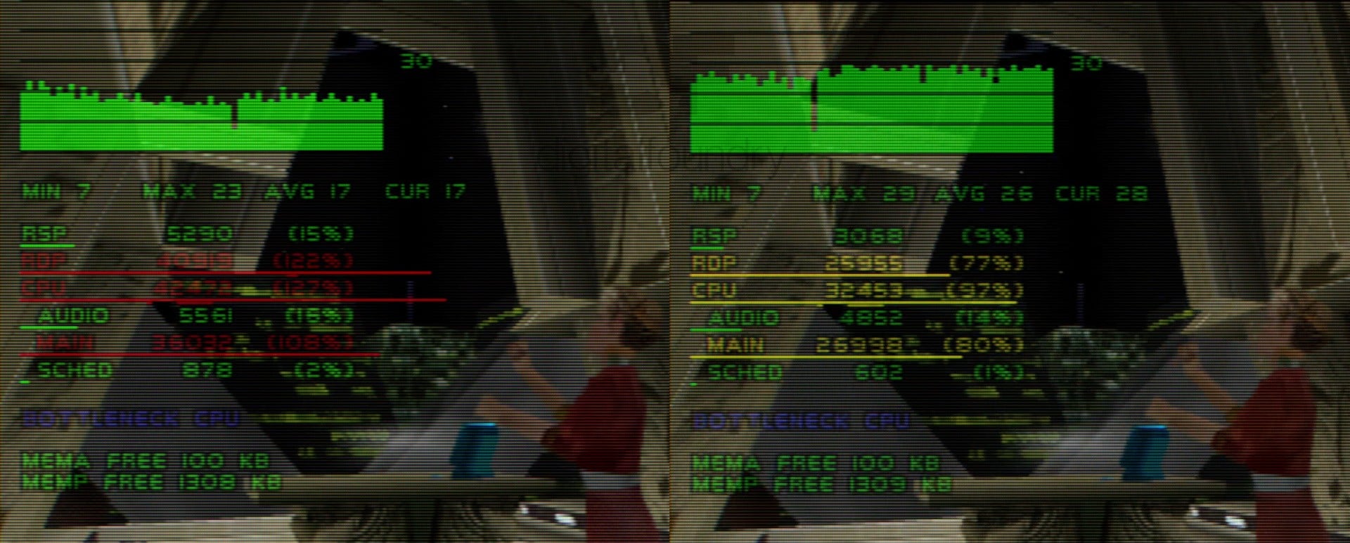 With overclocks disabled in the starting point of the game's first level, the N64's CPU and RDP (Reality Display Processor) are pushed above 90 percent use each with an average frame-rate reaching 28fps. With A3D set to its maximum "Unleashed" OC setting, those same system elements see their utilisation drop to 53 and 76 percent, respectively, with frame-rates averaging 44fps, a whopping 57 percent jump.