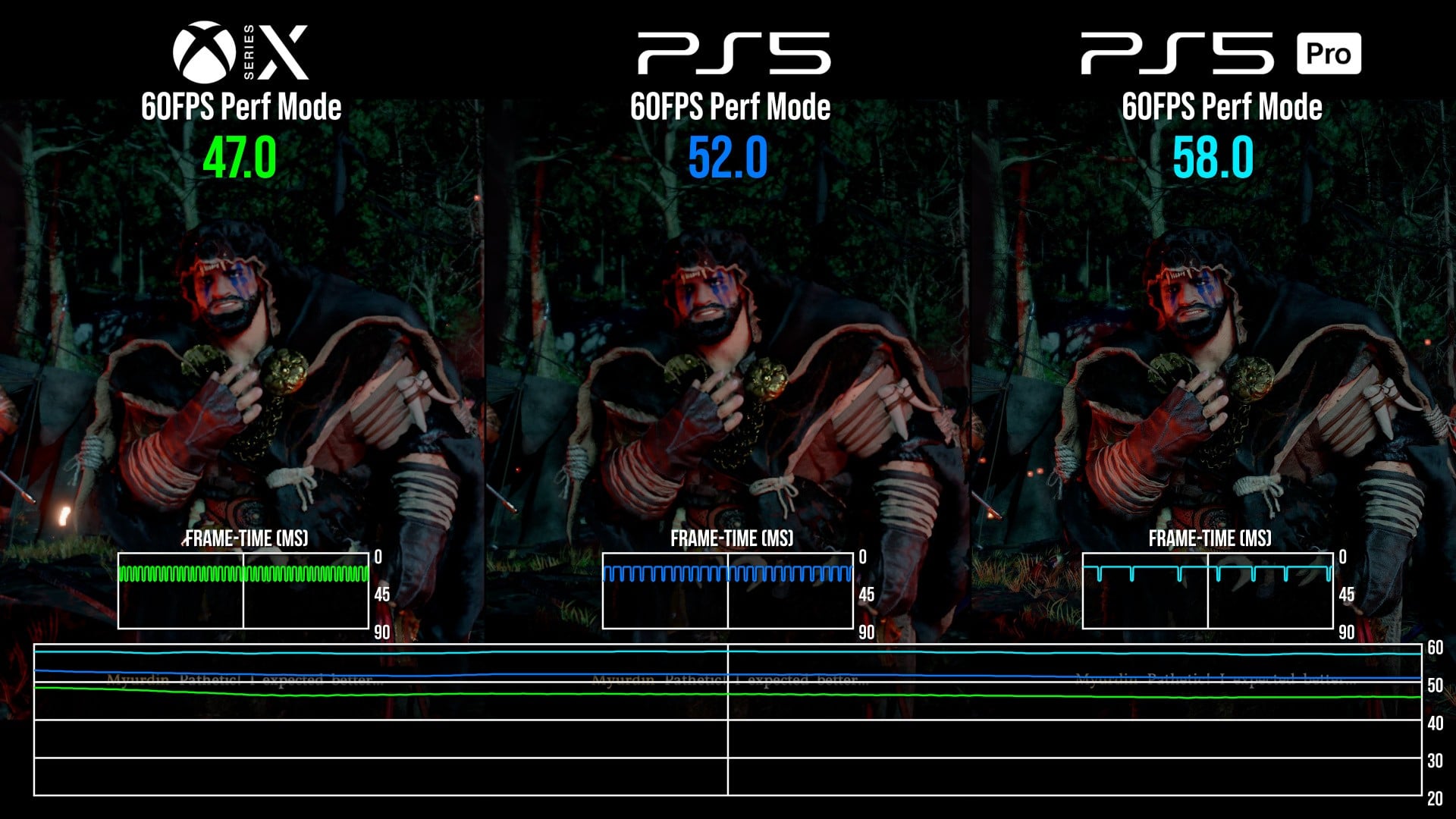 When testing raw frame-rates with the fixed 4K output option disabled, Series X generally maintains around a 3fps lead over the base PS5 in performance mode, with the PS5 Pro some distance ahead. As you'd expect, areas packed with NPCs offer a stern CPU challenge on Series X just as they do on other platforms, with Bug Hill and major cities causing performance drops into the 30s or worse. That means the game dips out of the VRR window, leading to screen tearing.