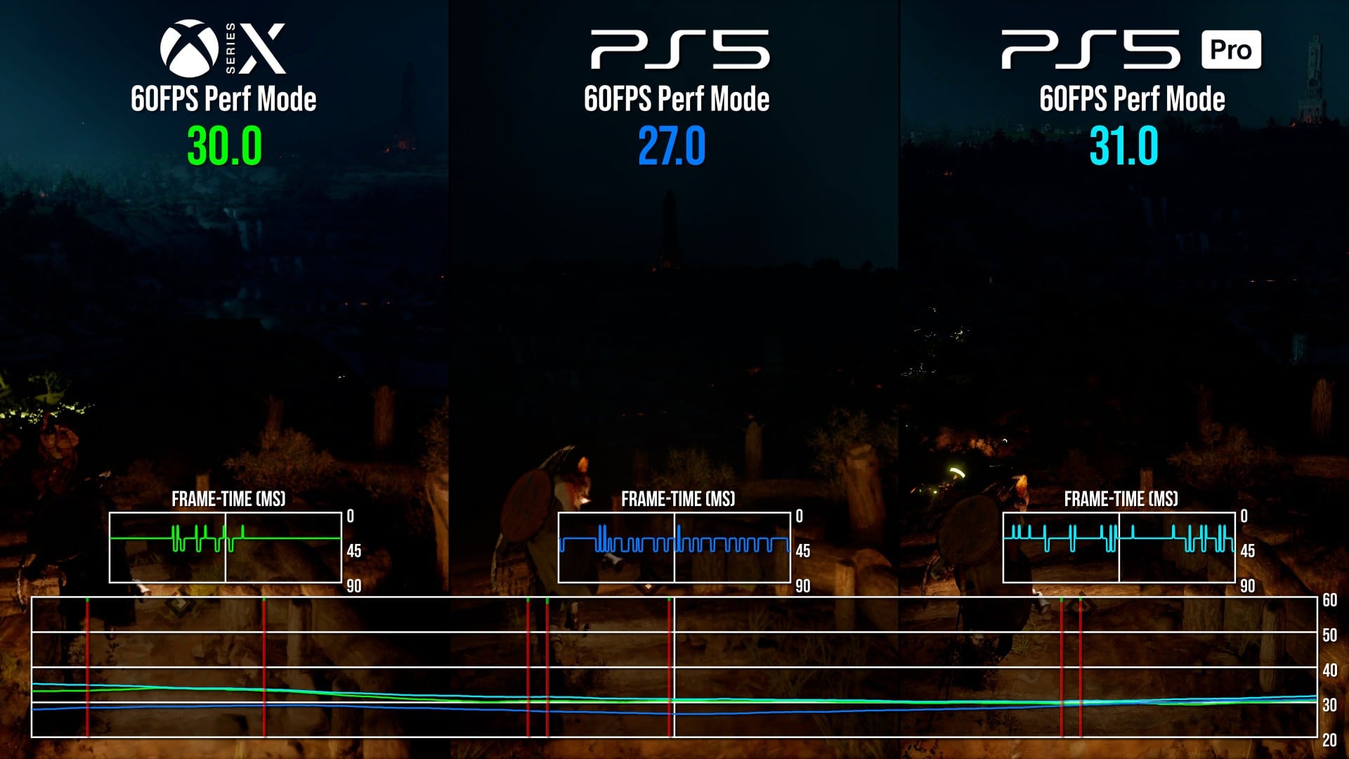 It's a similar scenario for balanced mode, where the Series X again slightly outperforms PS5 but still regularly drops below the 40fps target in combat or bustling cities. The 30fps quality mode is the most stable but can still become overstretched while swimming, battling or exploring dense areas.