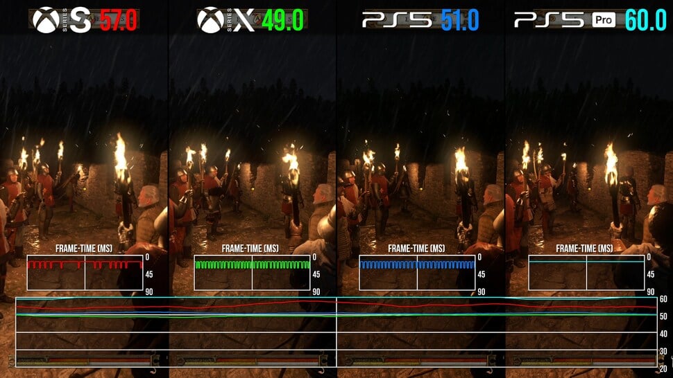 Performance is interesting, targeting 60 frames per second exclusively, with no 30fps quality mode alternative. Unfortunately, none of the current-gen consoles deliver a locked 60fps experience, but it makes sense that the more powerful PS5 Pro gets closest to the target. Looking at the base model, 60fps is met for interior shots and a lot of open world wandering - but swift camera movements momentarily confound dynamic resolution scaling, while harsher drops into the 40s are found in NPC-dense spots like Talmberg Barracks or Rattay Town - likely hitting the limits of the Zen 2 processor's capabilities.