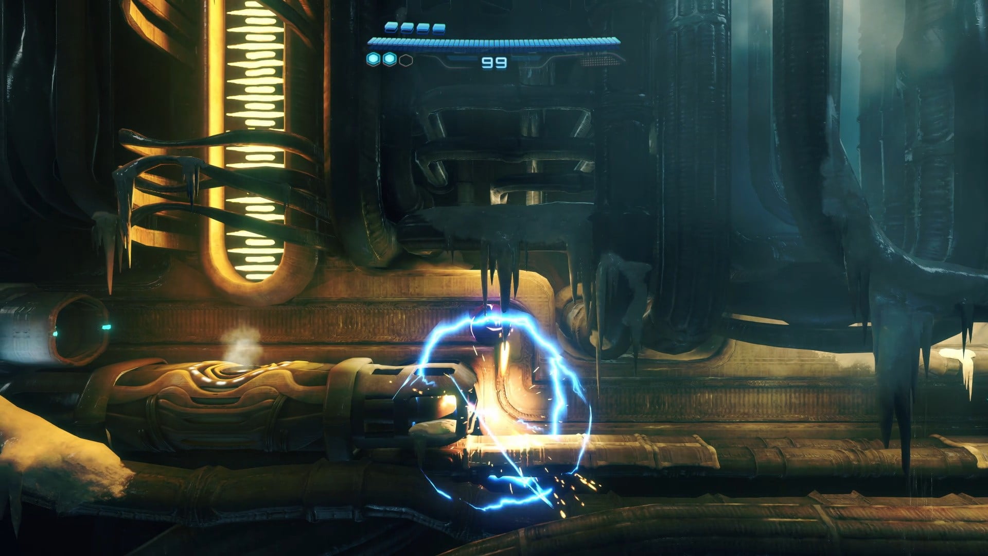 For example, the lush, foliage-lined Fury Green region adds a crucial twist of its core being made of alien architecture, thus delivering an evocative visual contrast between organic and eerie materials. Volt Forge's rain-soaked series of ornate spires connect via massive skybridges, and the resulting aesthetic looks like an HR Giger-inspired take on a Forerunner compound in Halo. And the journey of thawing out the Ice Belt medical facility combines a chilly, bone-white ruin with the eventual supercharged electricity and effects that melt the frost and clear Samus's path.