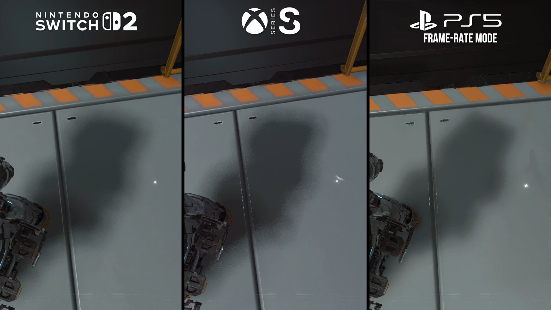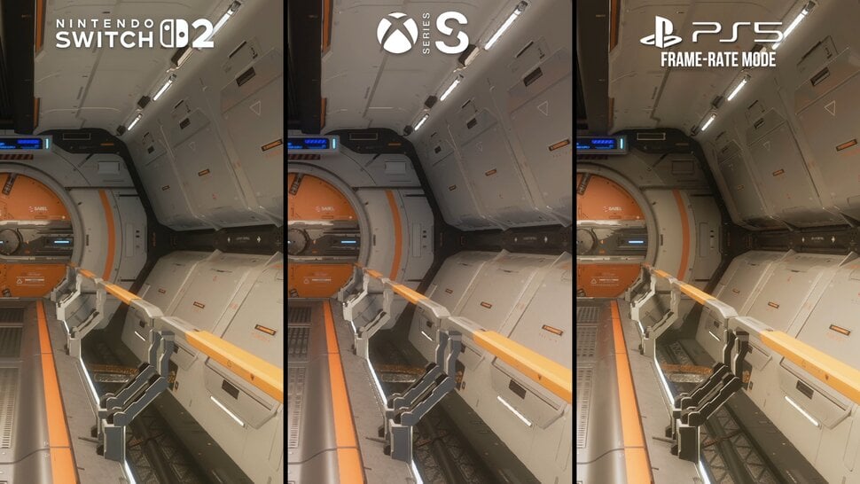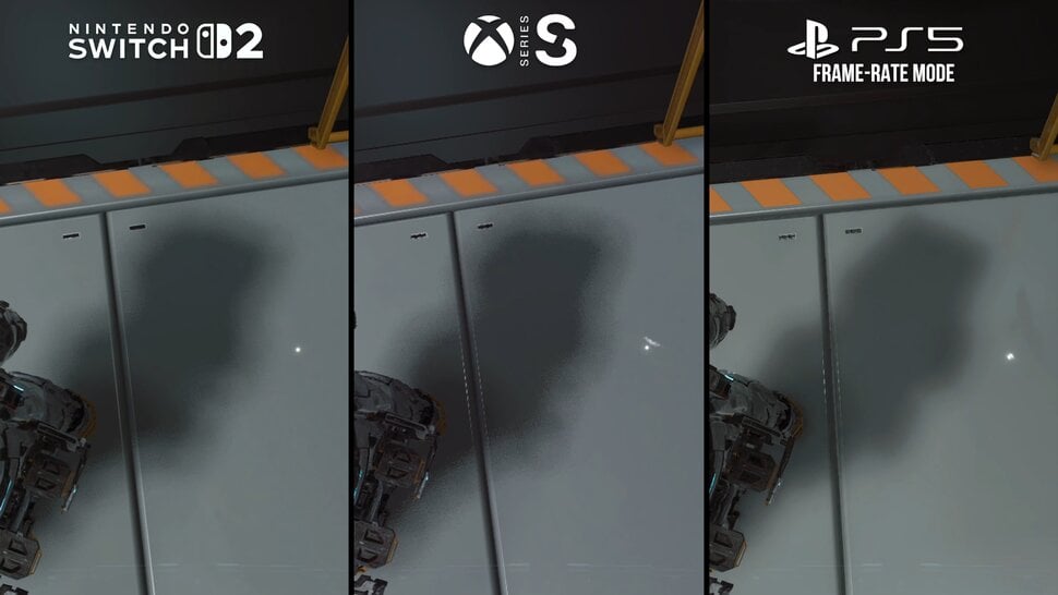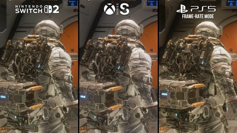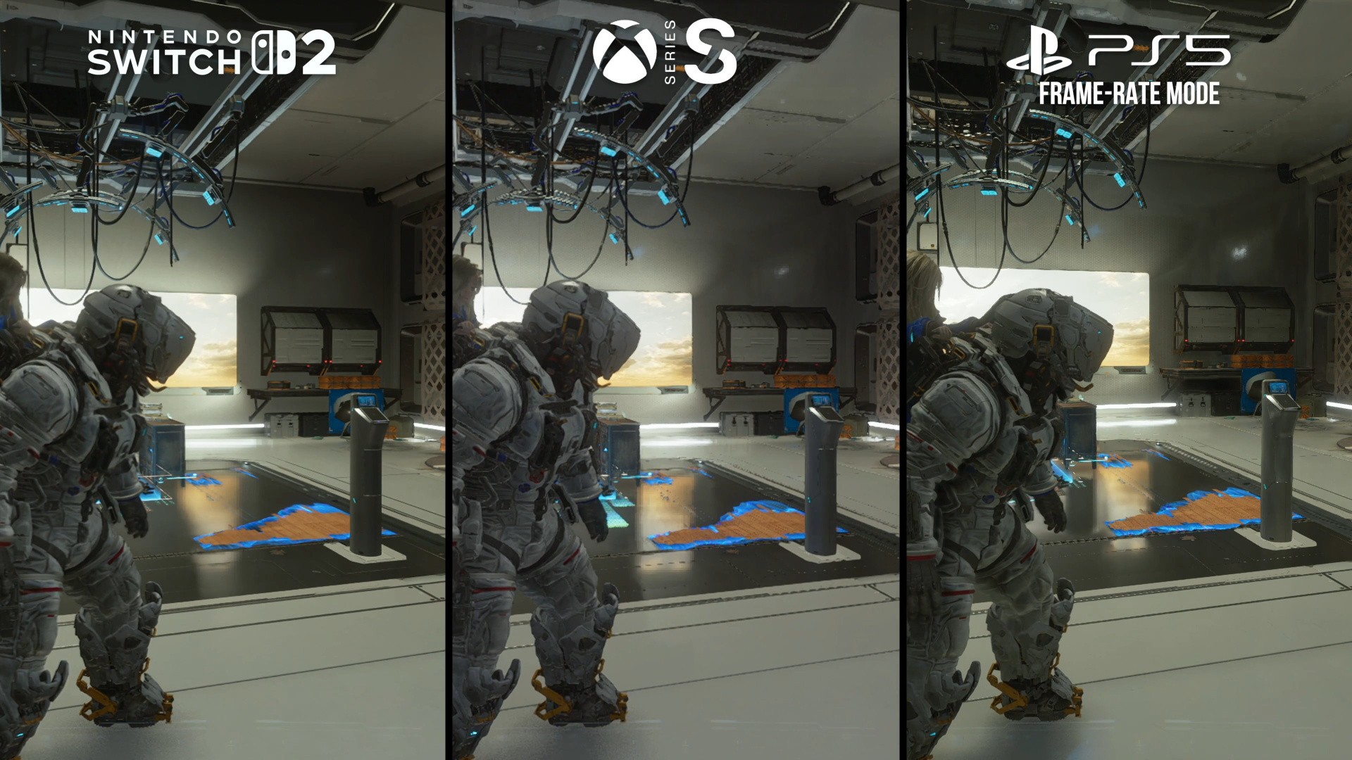 Reflections and asset quality follow a similar downward trend on the hybrid console. Screen-space reflections on Switch 2 appear rougher and lower-res than those on PS5, even though the Sony console does not use ray-traced reflections in its performance mode. Geometric features have also been simplified; curved assets, such as the astronaut's gloves, appear chunkier and less rounded, while textures are noticeably simplified and low-resolution. These compromises are most conspicuous during cutscenes and in larger, artistically dense environments.
