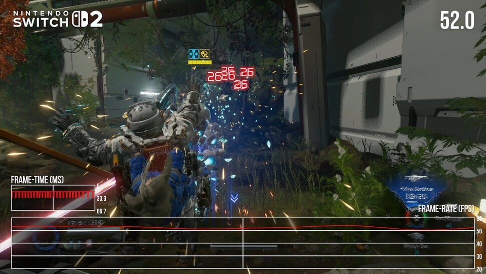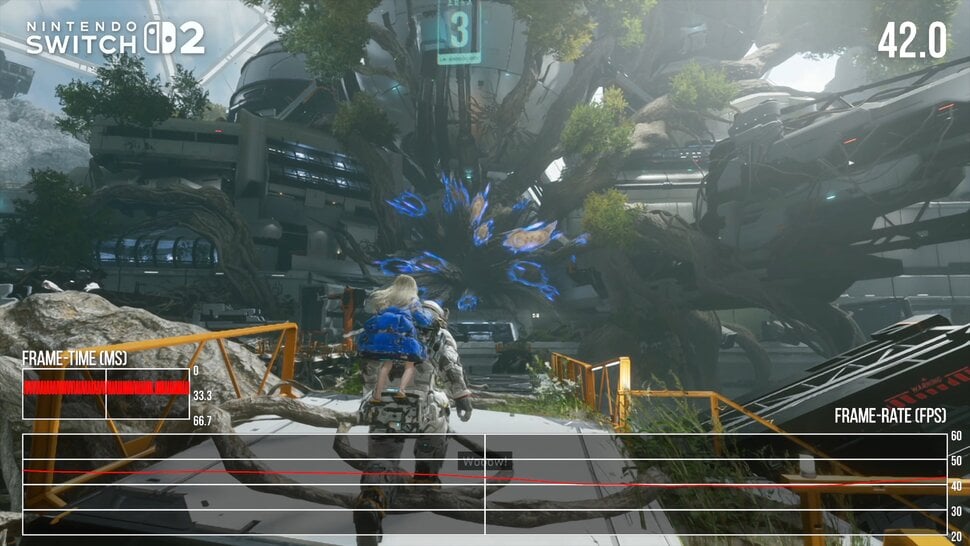 When moving to handheld mode, the internal resolution of the Switch 2 version drops to a paltry resolustion in the region of 360p. While DLSS helps the image hold up better than expected, the result is still muddy and prone to aliasing. Performance in handheld mode is also depressed relative to docked play, with frame-rates often lingering in the 30s. Furthermore, VRR does not appear to be functioning correctly, as the game rarely outputs a stable run of frames even within the console's supported VRR window.