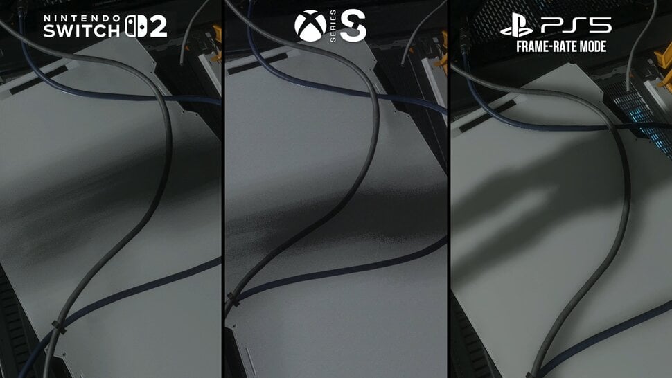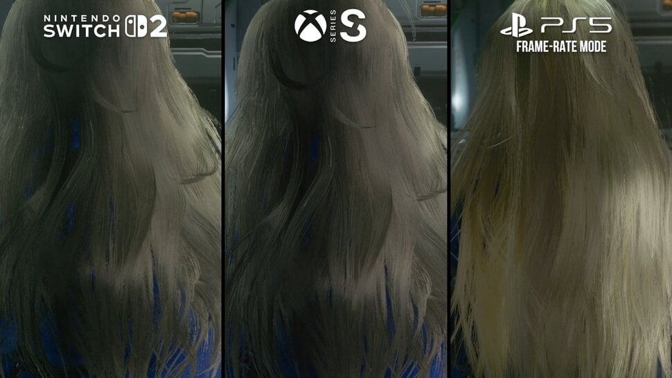 A fairer hardware comparison for the current-gen Nintendo hybrid is the Xbox Series S, which shares many of the same visual compromises. Both consoles feature simplified GI, lower-quality shadow maps, and card-based hair. However, the Switch 2 actually holds several advantages over Microsoft's smaller console despite its performance disadvantage. The Series S suffers from noisy, dithered shadow penumbra, whereas the Switch 2 is cleaner, while texture details are often better preserved on the Switch 2 than on the Series S.