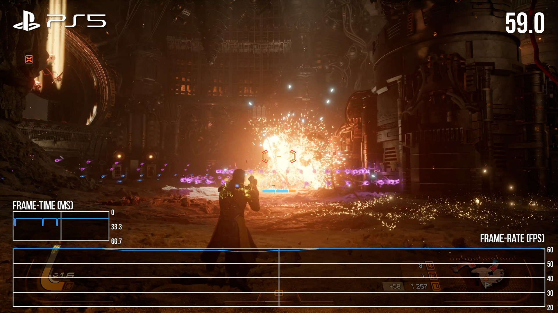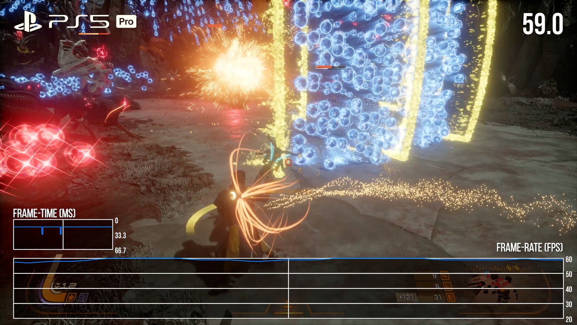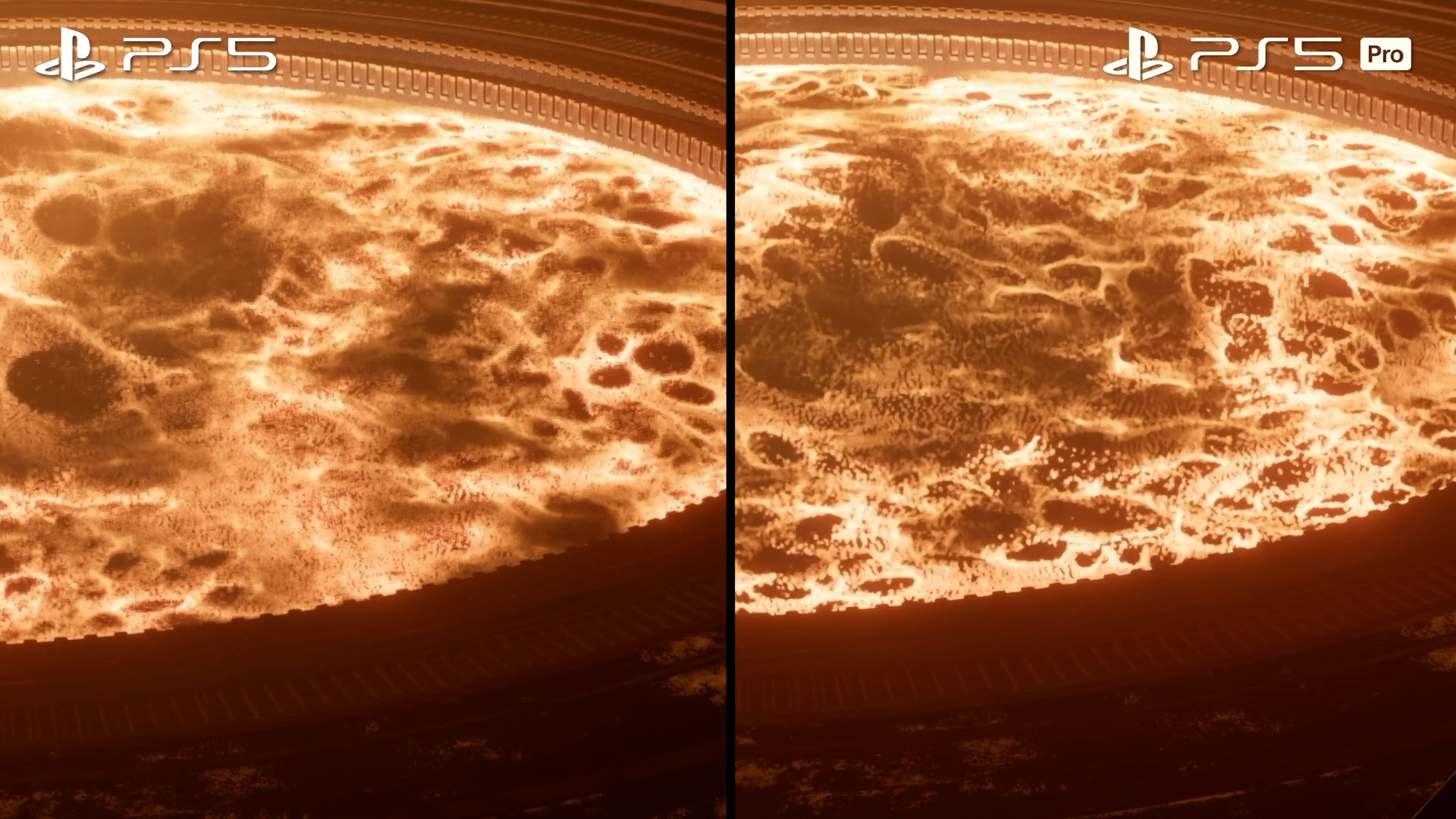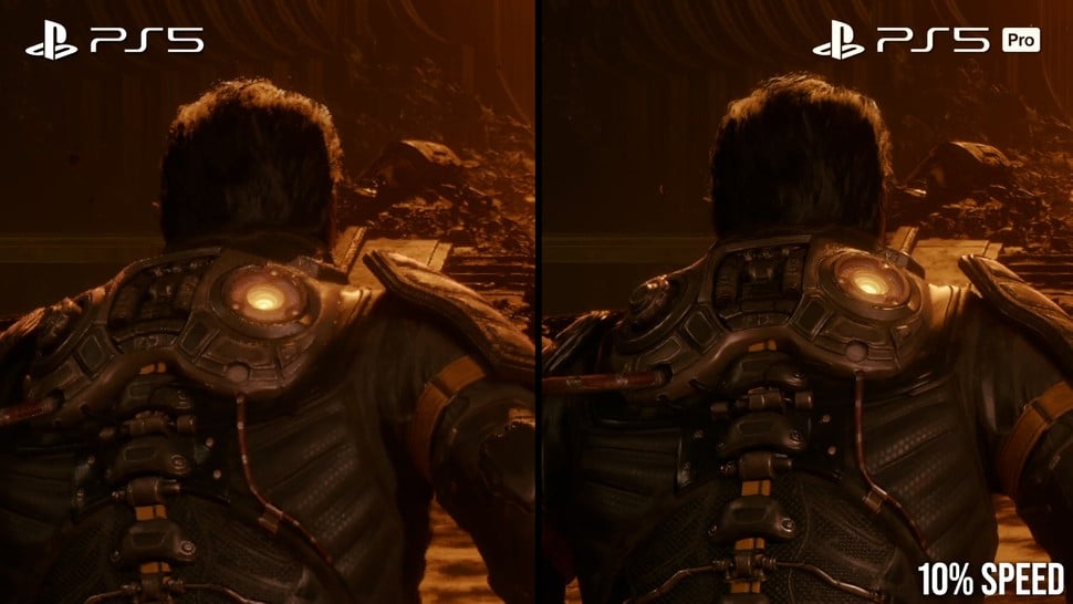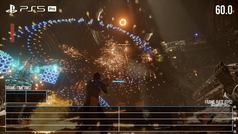 On PS5 Pro, Saros truly excels, with a single 60fps mode that targets a 4K output with PSSR upscaling. This solution is exceptional because it handles the complex and demanding particle effects remarkably well, keeping them stable and acceptably sharp, a feat many temporal upscalers struggle with. The internal resolution of 1440p produces pristine image quality, and frame-rates are consistent with only minor drops during some sequences. Note that real-time cutscenes can drop to 30fps, while pre-rendered videos are encoded at 24fps, presenting a bit of a mismatch.