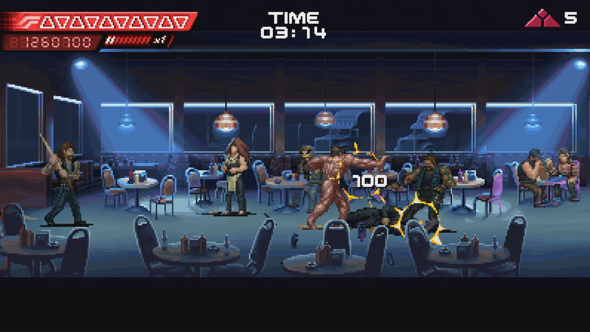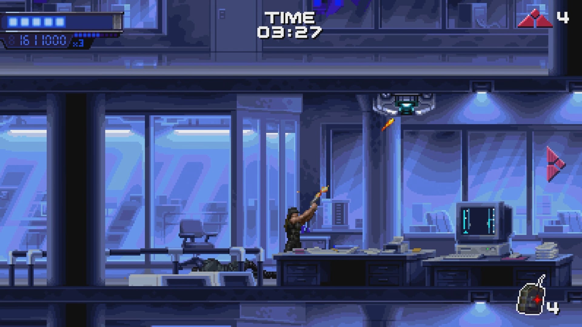 The rest of the levels directly crib from the film and combine tasteful movie-moment adaptations with retro-calibre mechanics and aesthetics. Infiltrate Skynet's labs as the pistol-packing Sarah Connor and engage in terse, aim-and-run side-scrolling mechanics that in some ways resemble Elevator Action Returns. Land as a time-travelling Arnold Schwarzenegger in the nude, then pummel drunkards at a bar in a three-quarters brawler interface that adds walking toward and away from the camera.