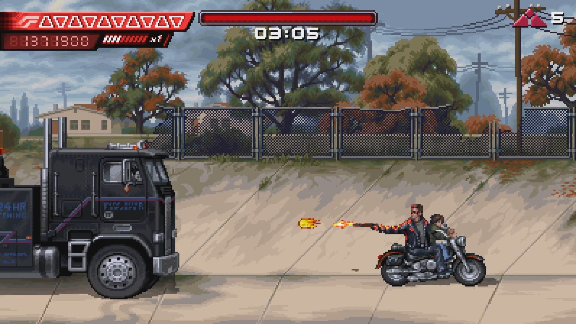 Or hop on Arnie's motorcycle and rescue young John Connor while being chased by a semi truck in a scene that faithfully recreates the film's iconic, sun-stricken Los Angeles Bull Creek scene using 16-bit pixel-art. Each level's palettes feature bright and varied colour applications that appear to employ intentional limitations, arguably to fit into whatever past-gen console specs this game may eventually launch on. Whichever those may be, the game will require a hefty size maximum to support beautiful, fluid animations that are packed with individual frames but never reduce each action's button-tap impact.