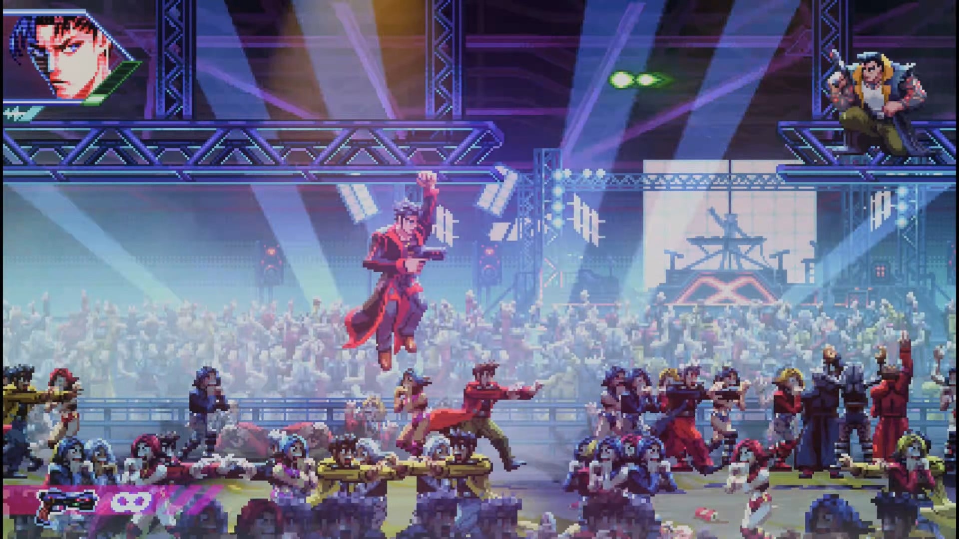 Neon Inferno employs a more modern technical framework that exceeds even the sprite-rendering prowess of the Sega Saturn. Streaks of shading cut through the air and touch surfaces to simulate light sources, while backgrounds are crammed full of sprites ranging from skyscrapers to flying cars to even hundreds-strong crowds of dancers at a nightclub.